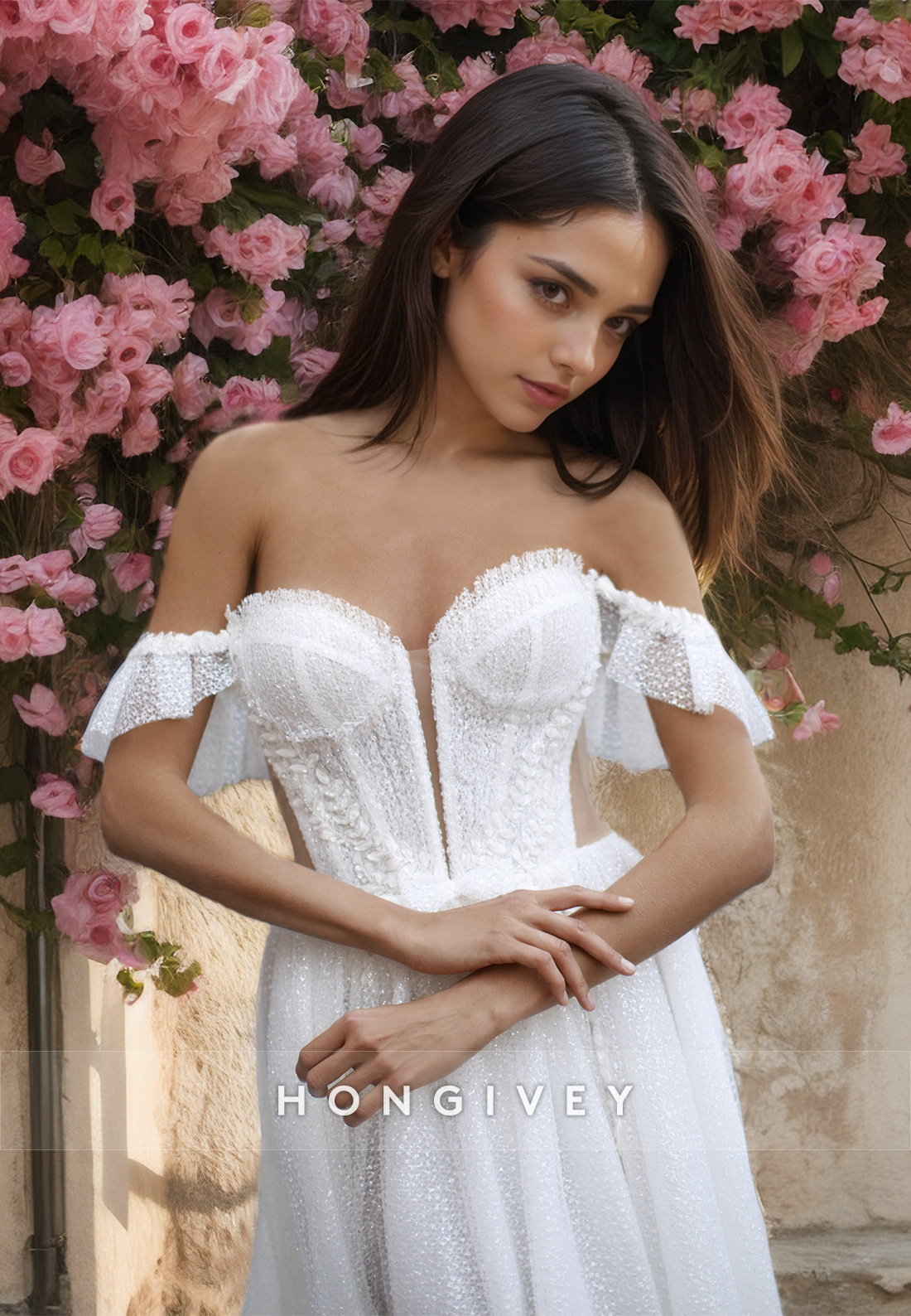 This stunning wedding dress from HONGIVEY features a sexy off-shoulder design with delicate appliques and a sheer back, all crafted from high-quality tulle. Make a statement on your big day with this elegant and modern dress.