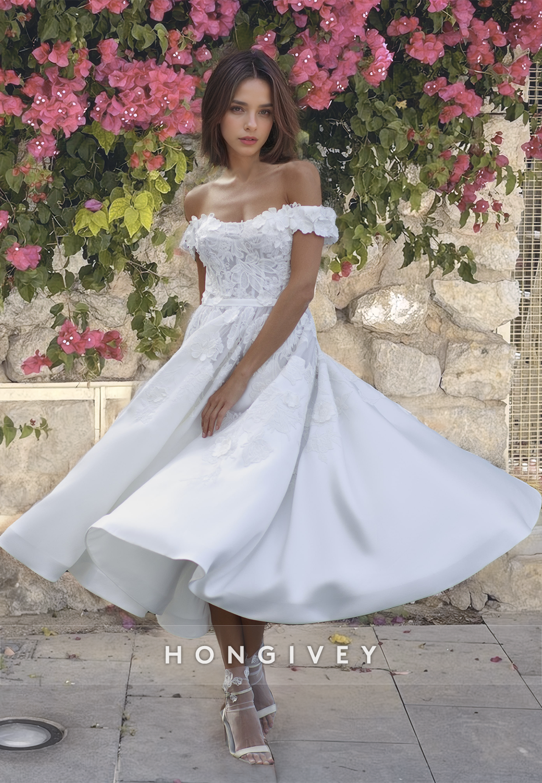 Floral Applique A-Line Wedding Dress Off-Shoulder Satin Midi Dresses HONGIVEY