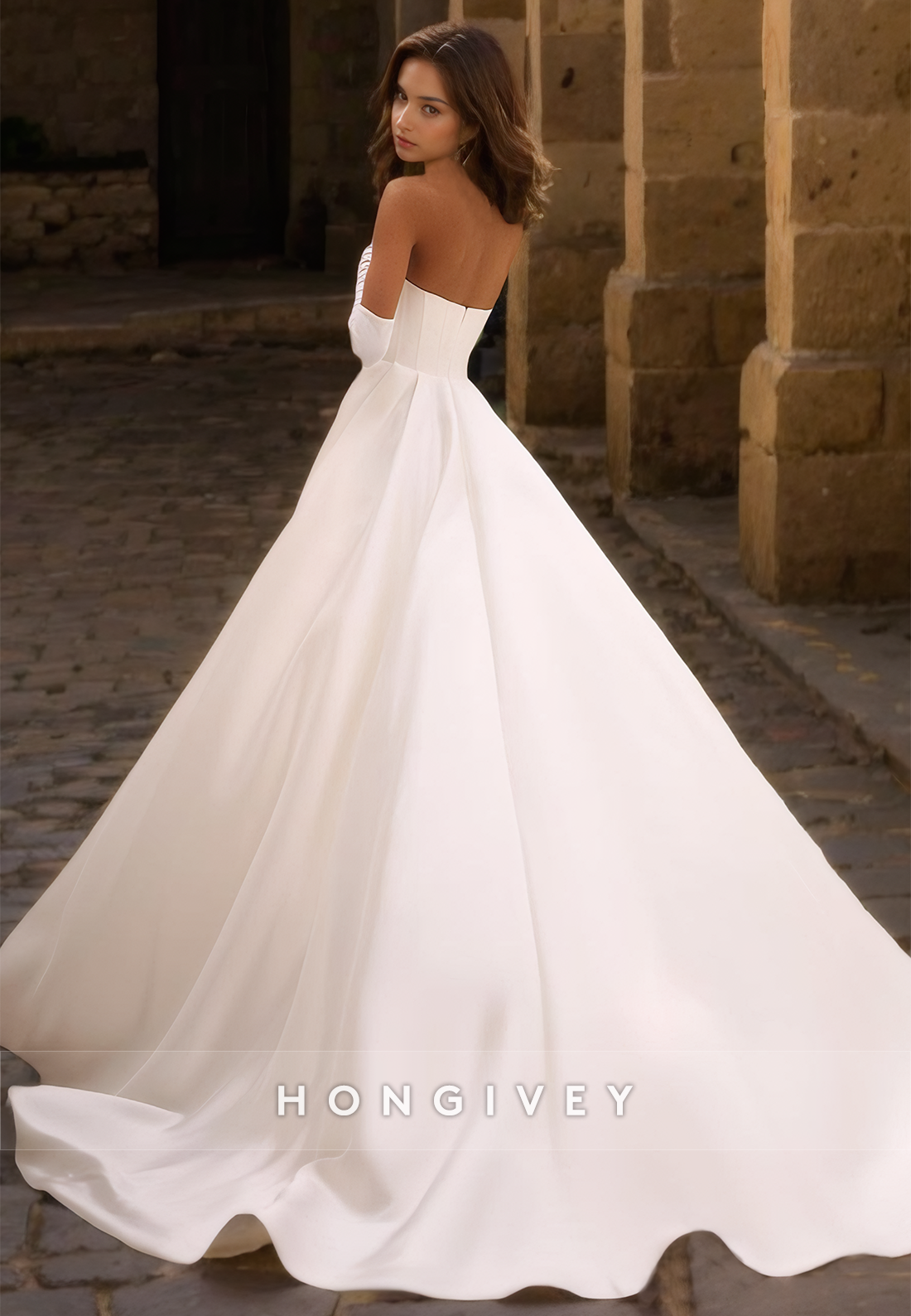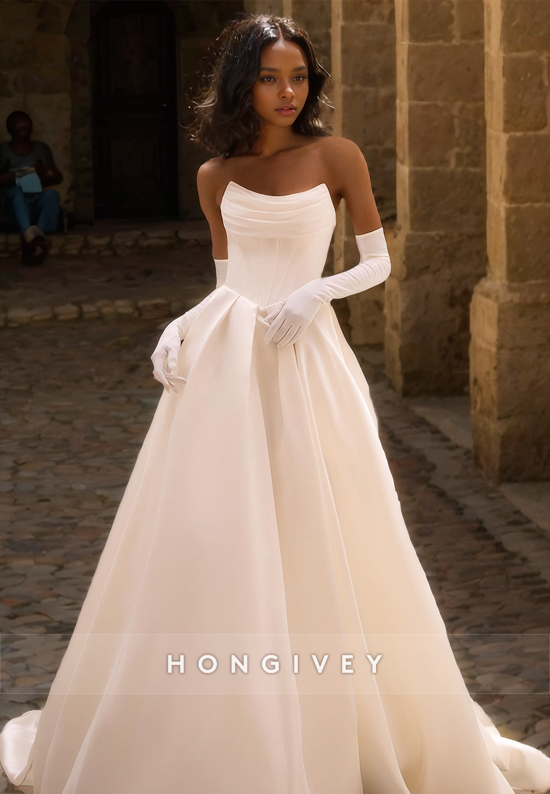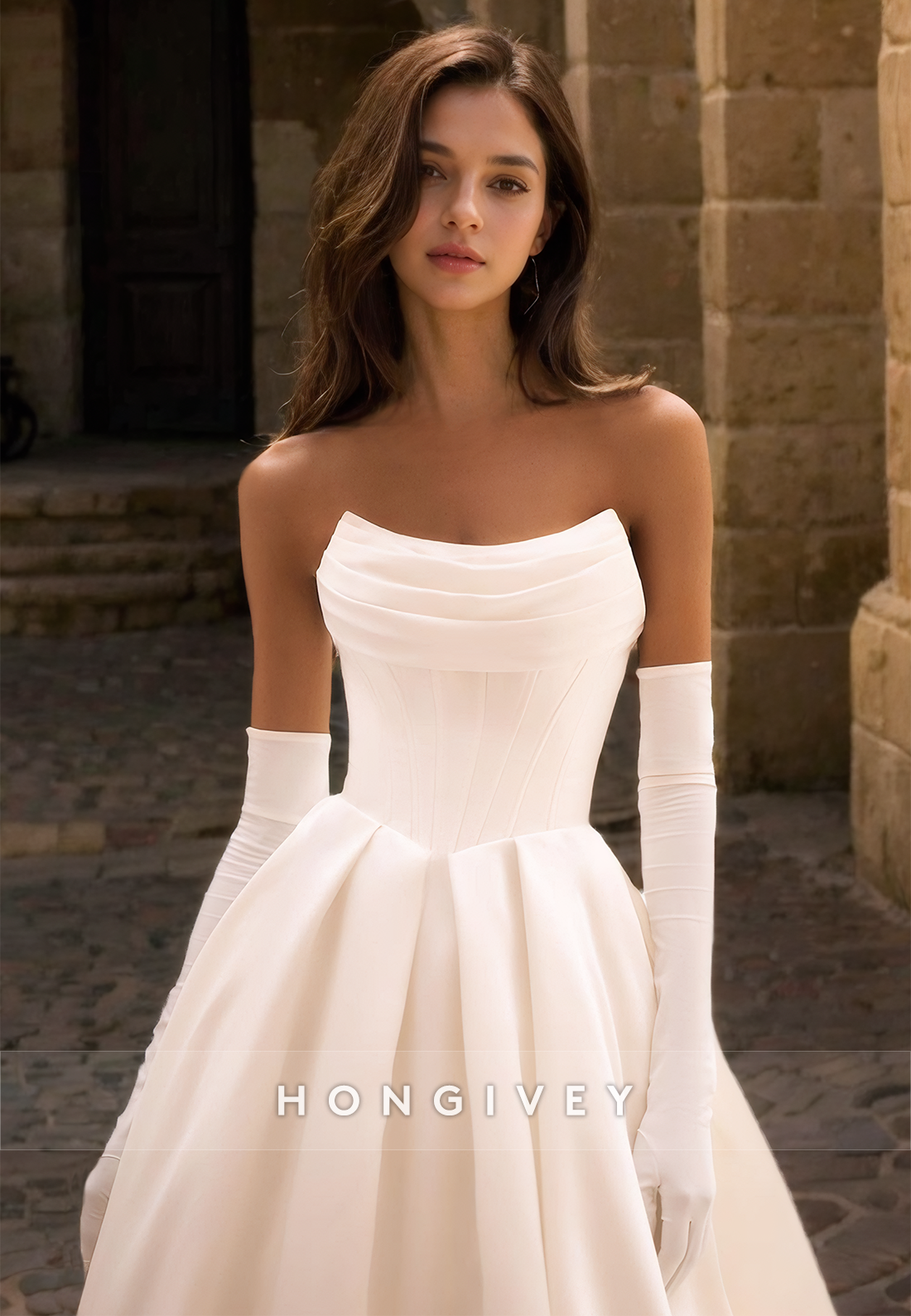 Sexy Satin A-Line Bateau Strapless Ruched Empire With Gloves Train Wedding Dress