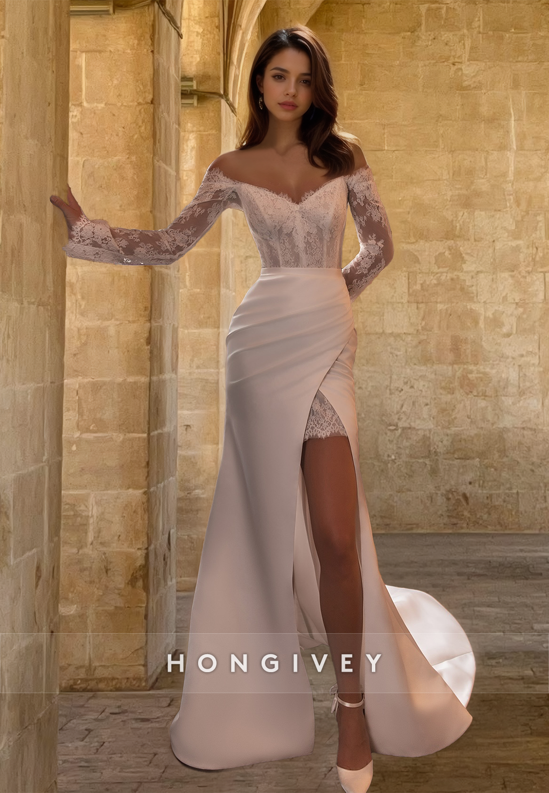 Sexy Sheer Slit Sleeves Lace Applique with Train Wedding Dress HONGIVEY