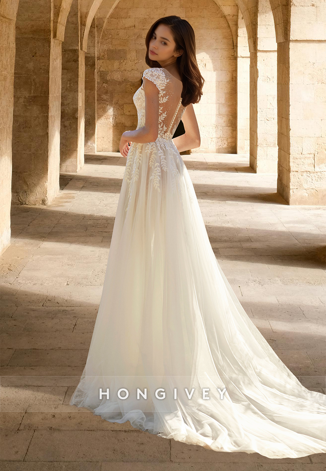 Short Sleeves Applique Beaded A-Line Tulle with Train Bridal Wedding Dress