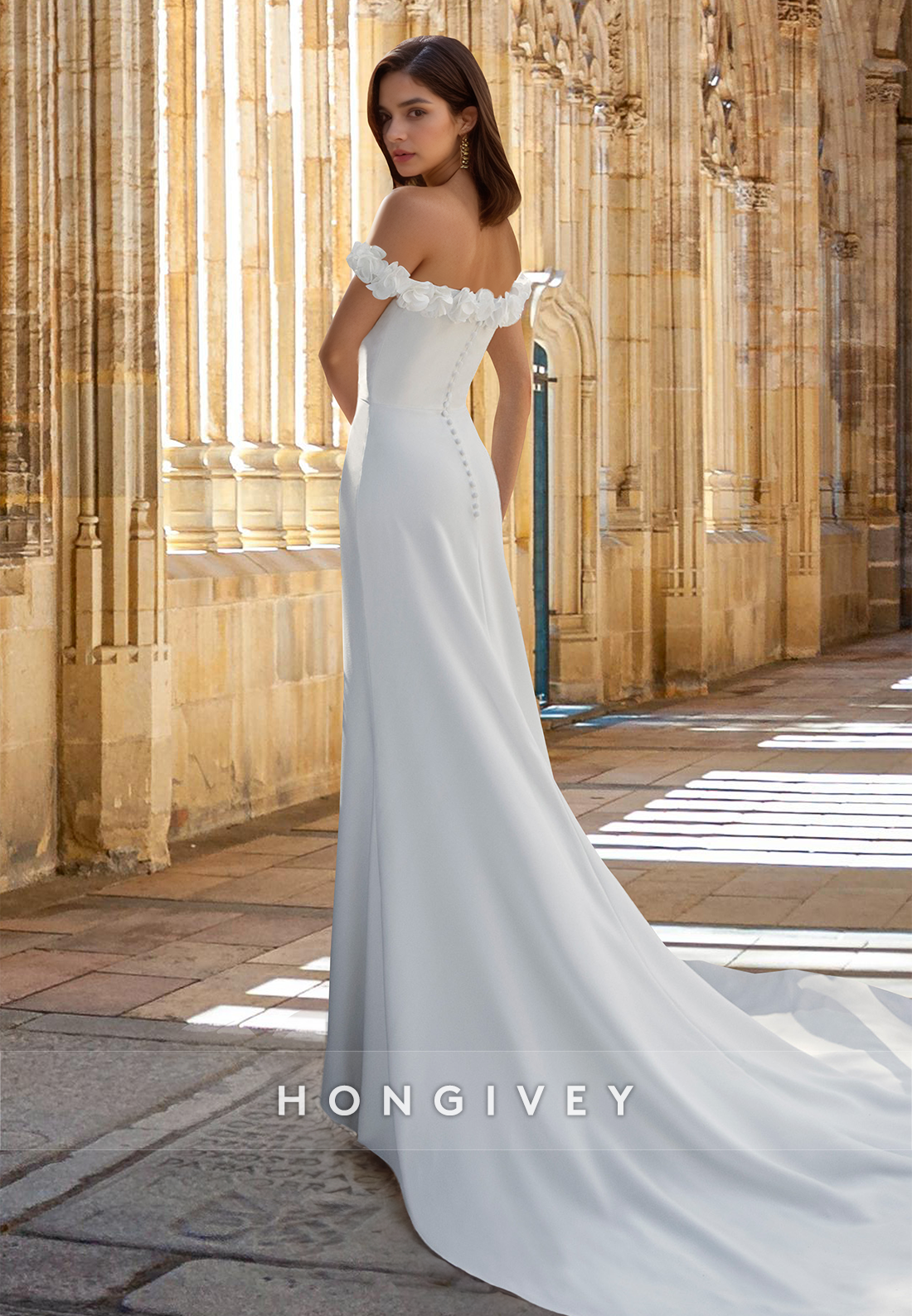Chic Floral Off-Shoulder Sheath Satin with Slit Bridal Wedding Dress 2025