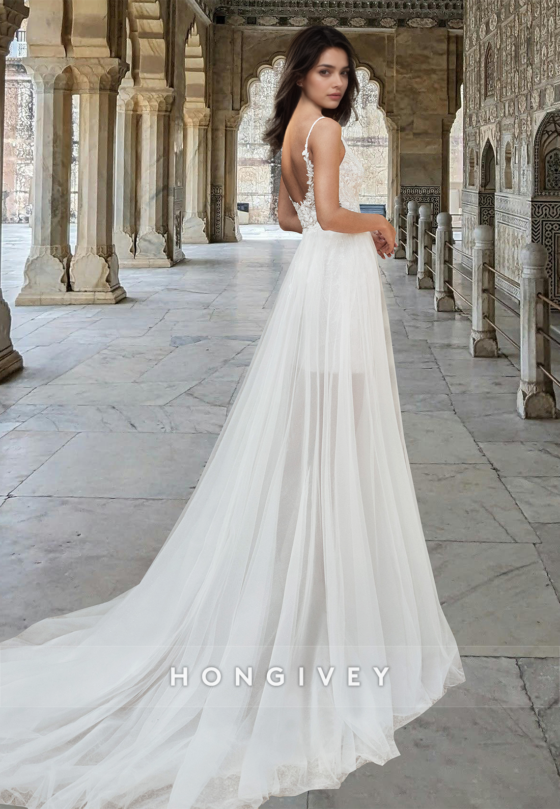 Sexy Short V-Neck Spaghetti Straps Applique with Train Bridal Wedding Dress