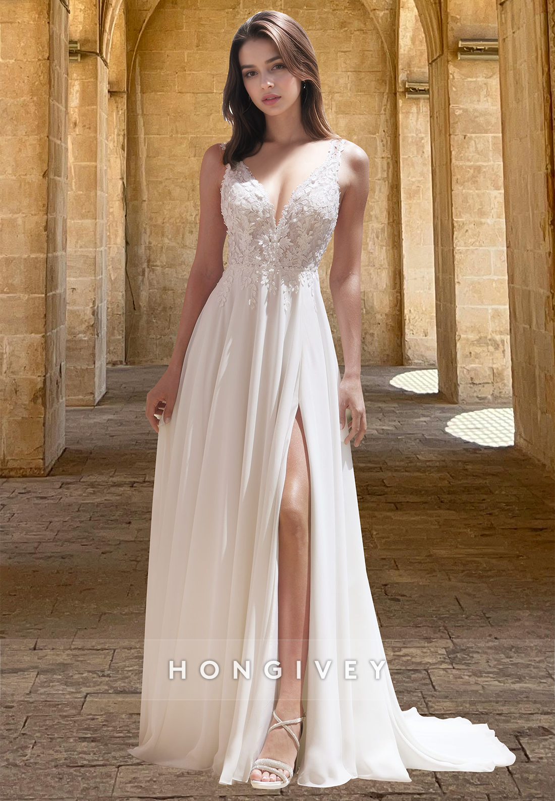 Tulle V-Neck Spaghetti Straps A-Line with Slit Applique Bridal Wedding Dress