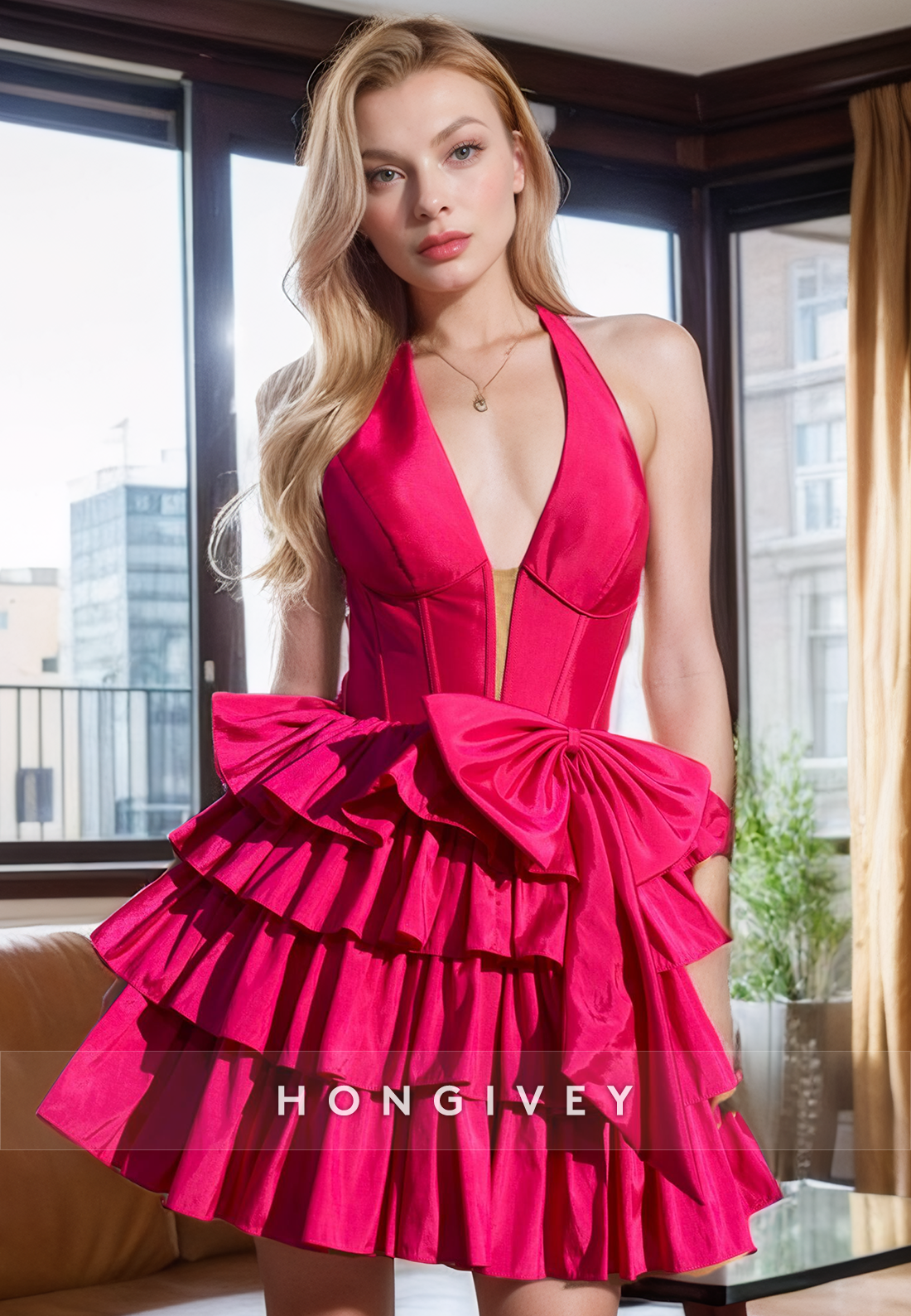A-Line Low V-Neck Halter Bowknot Party Evening Homecoming Dress