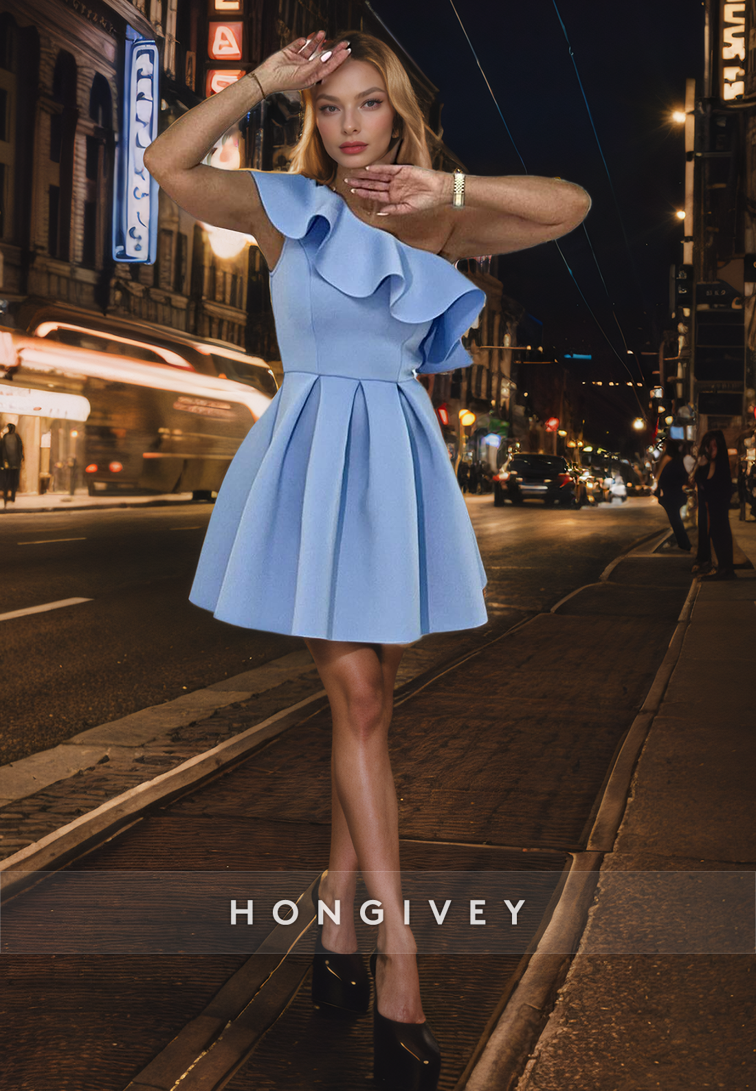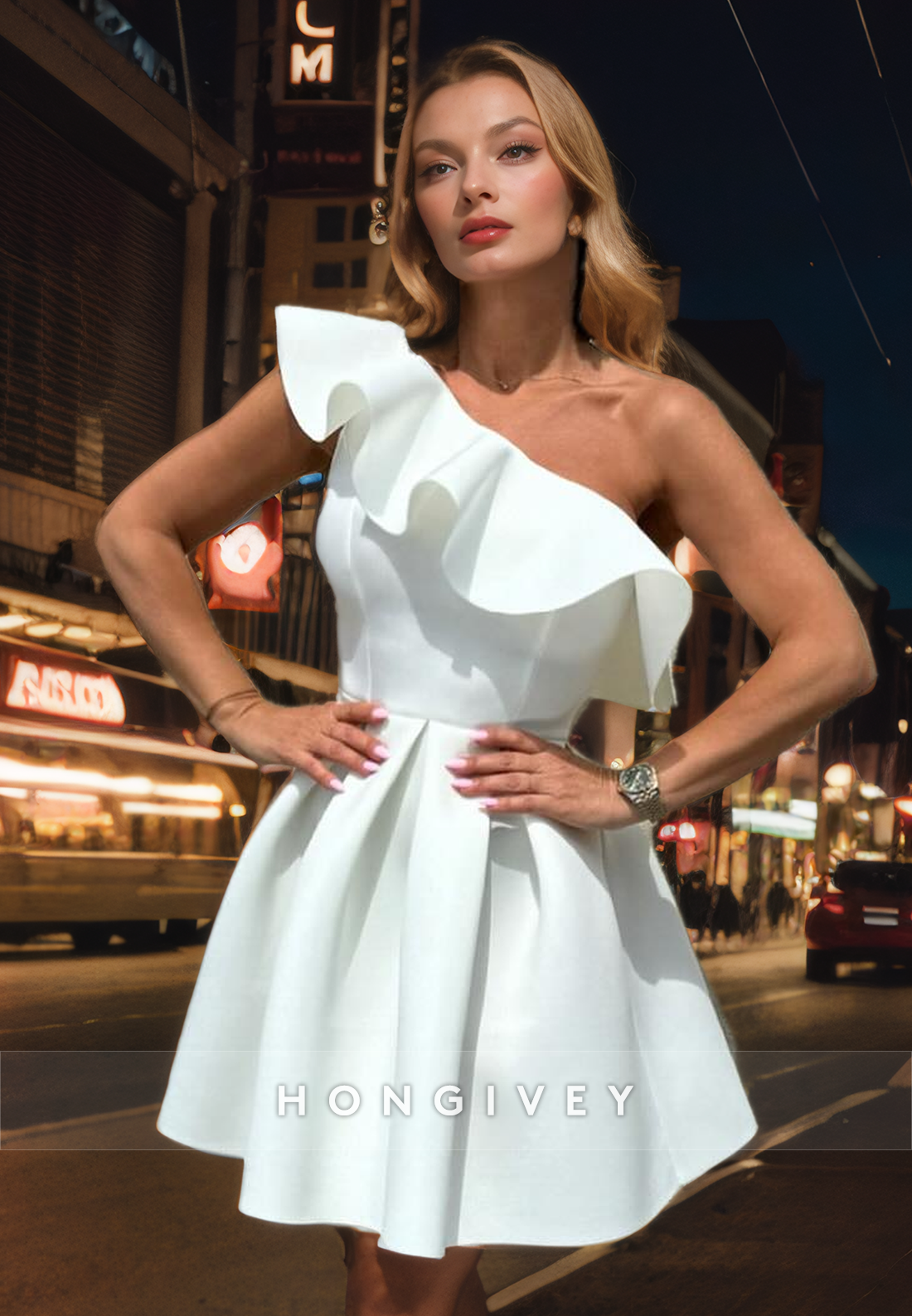 Satin A-Line One Shoulder Ruffled Short Homecoming Dress
