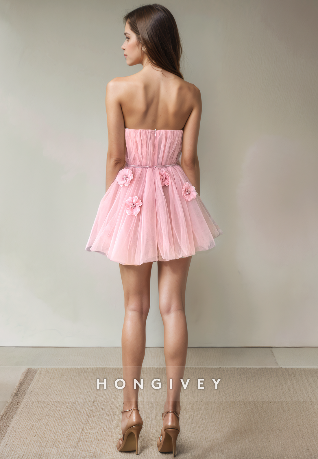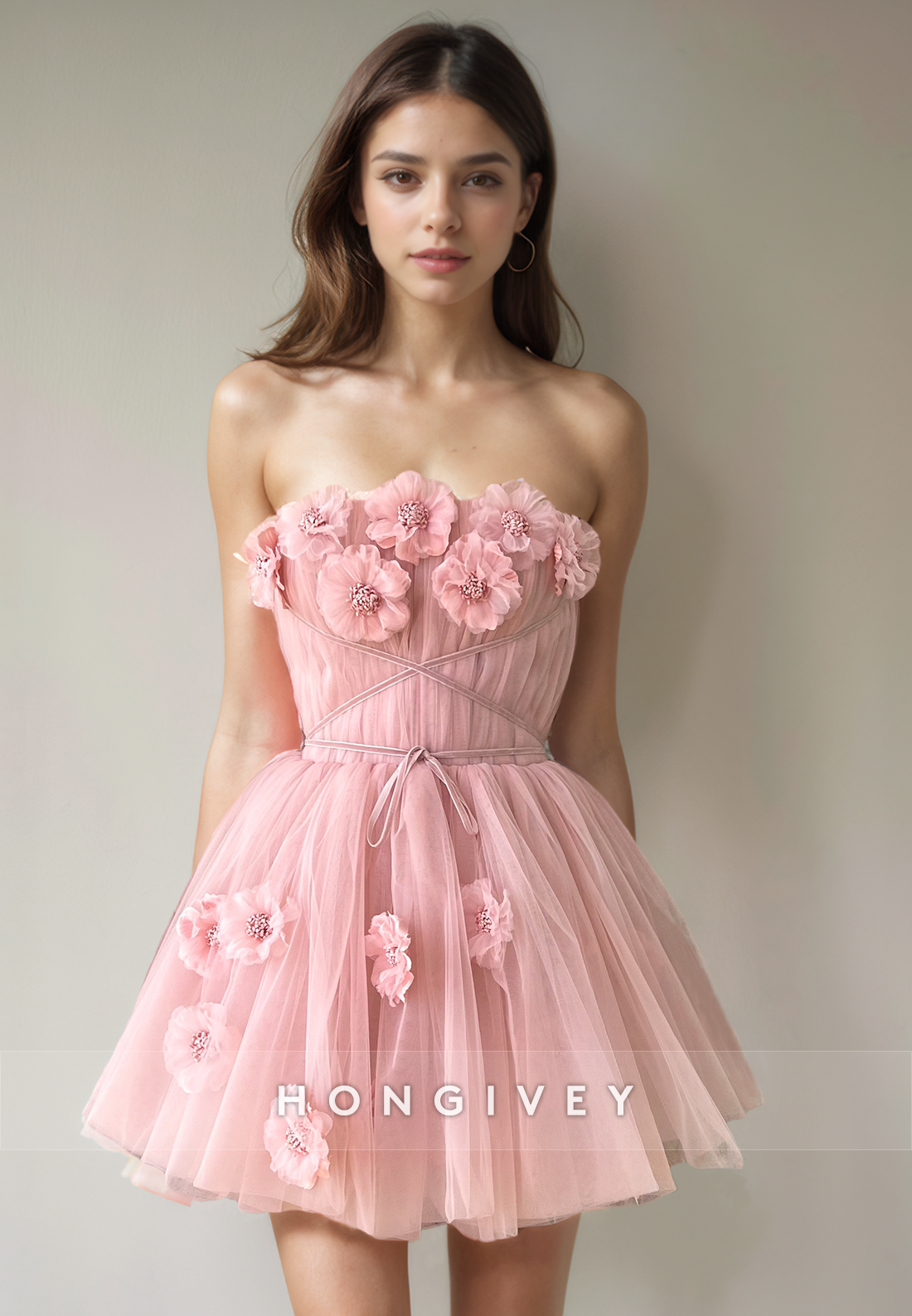 Sweet Tulle A-Line Strapless Floral Embossed Short Party Homecoming Dress