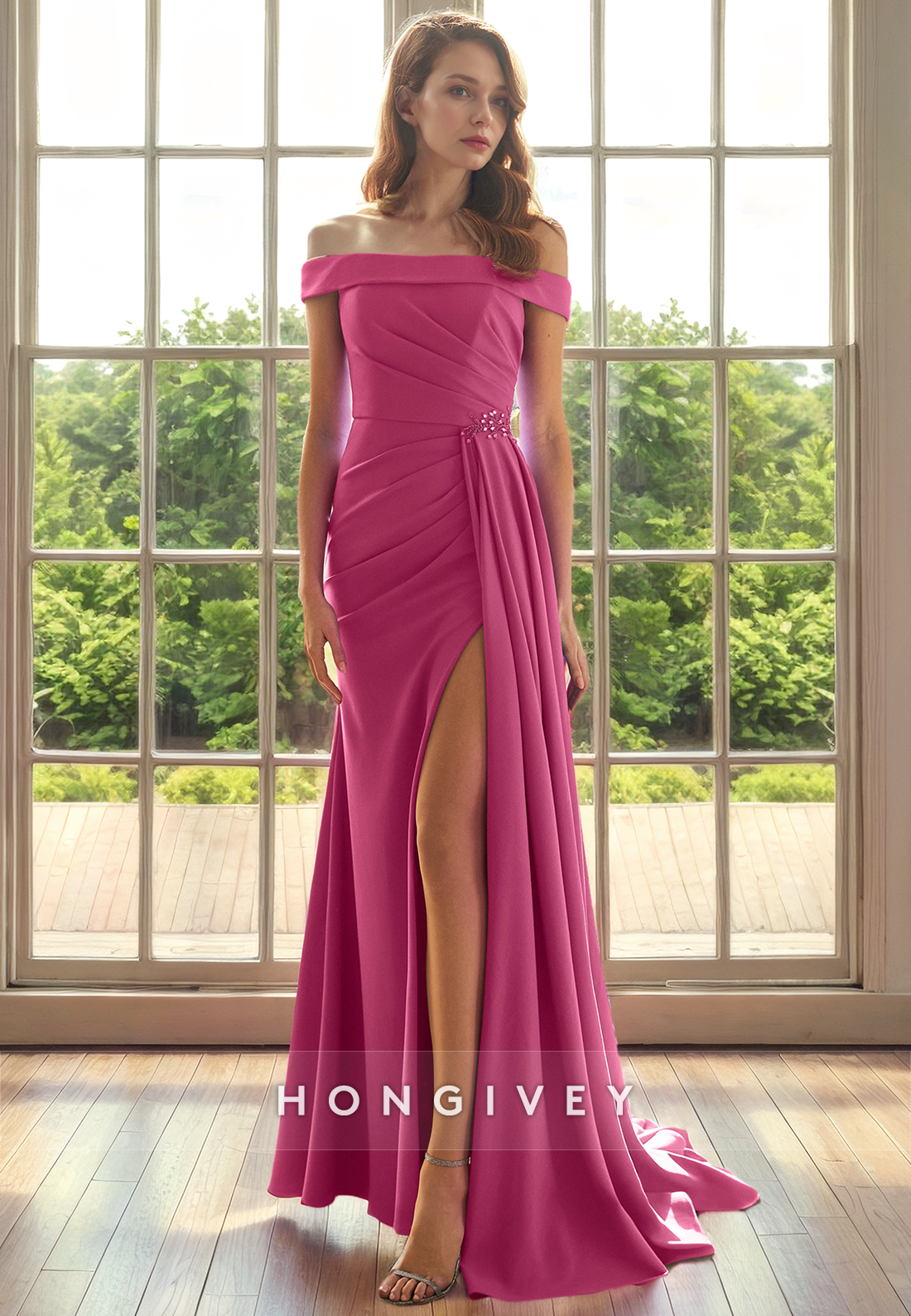 Satin A-Line Off-Shoulder Sleeveless With Side Slit Mother of the Bride Dress