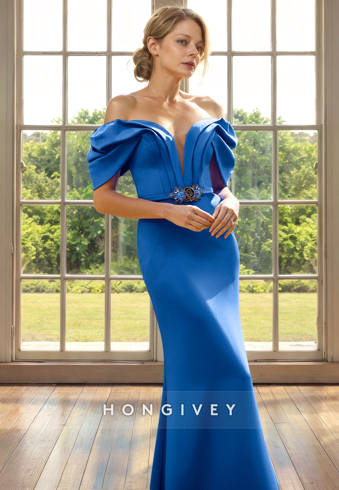 This elegant Trumpet Off-Shoulder Empire Ruched dress is perfect for the mother of the bride. The off-shoulder design and empire waistline offer a flattering fit, while the sweep train adds a touch of sophistication. The ruched detailing adds texture and dimension to this timeless style. Expertly crafted for a stunning look.