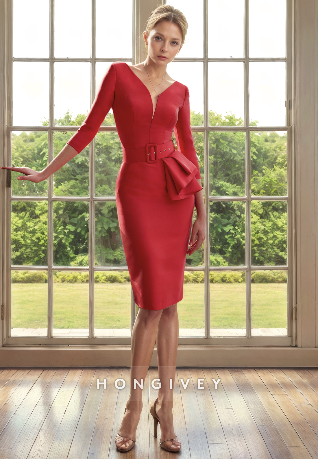 Satin Fitted V-Neck 3/4 Sleeves Knee-Length Mother of the Bride Dress
