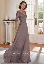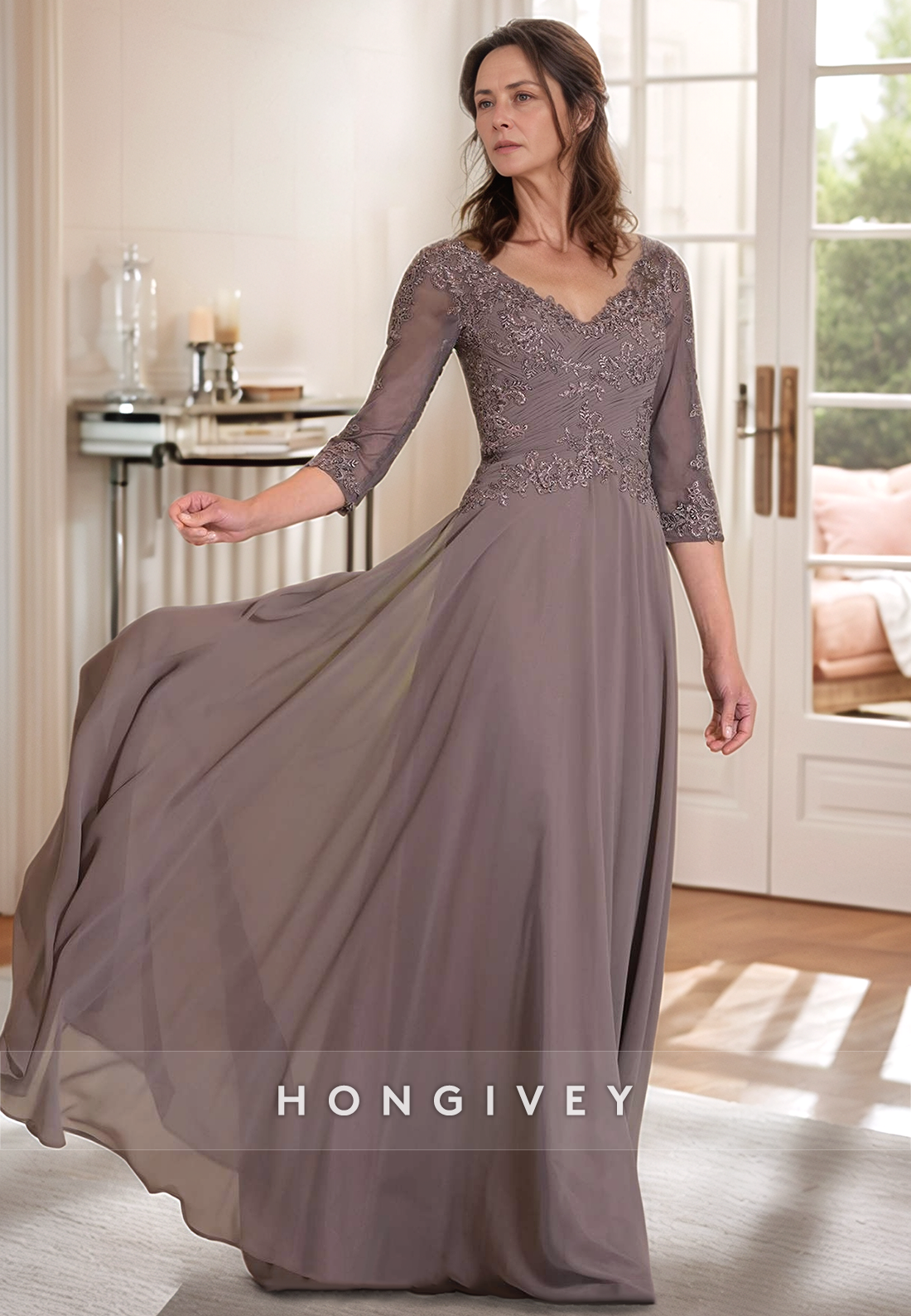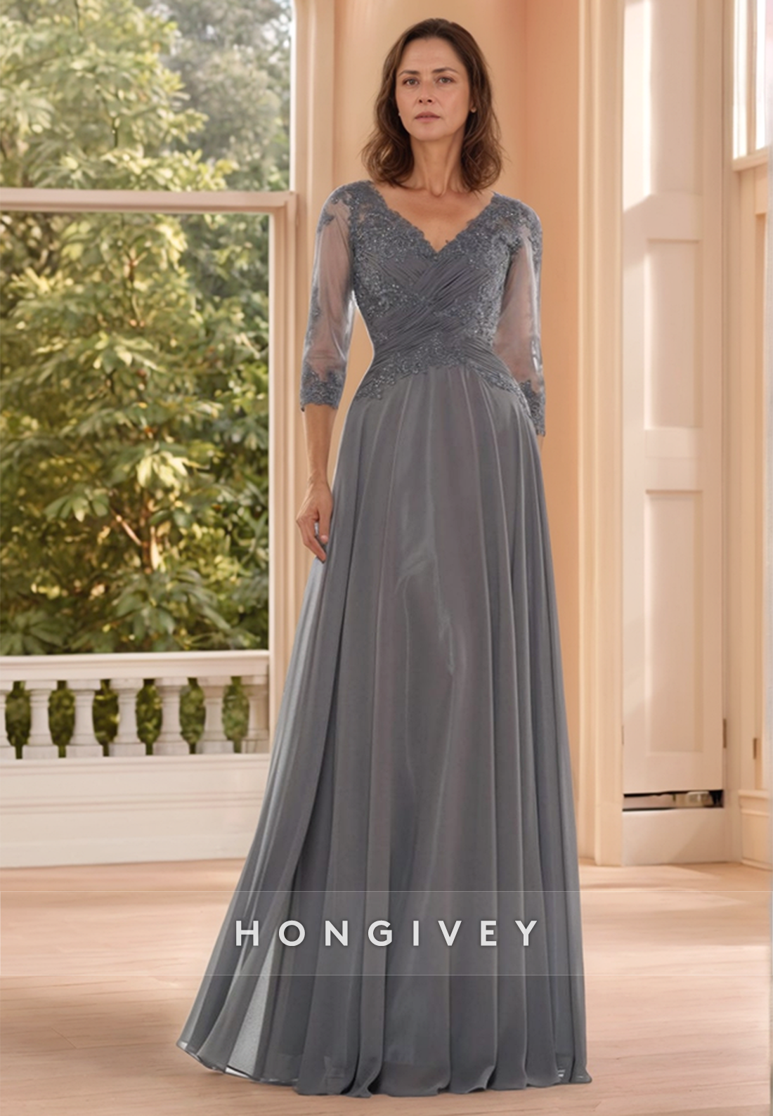 Sheath Sweep Train V Neck Lace 3/4 Sleeve Pleated Ruffles Mother of the Bride Dress