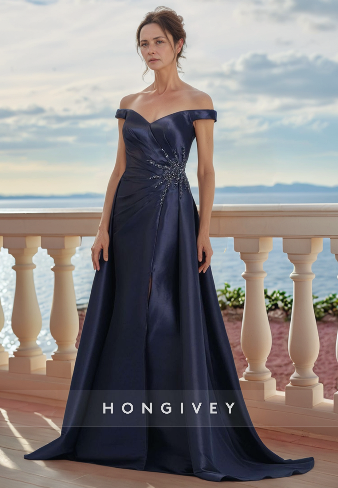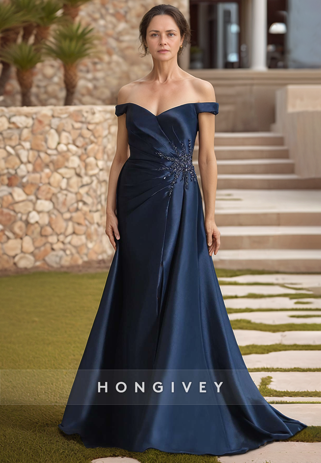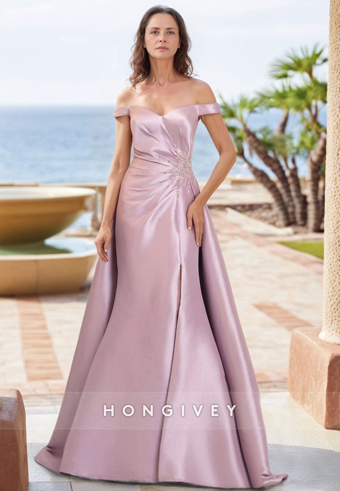 Satin Off the Shoulder Sweep Train Column Pleated Rhinestone Mother of the Bride Dress
