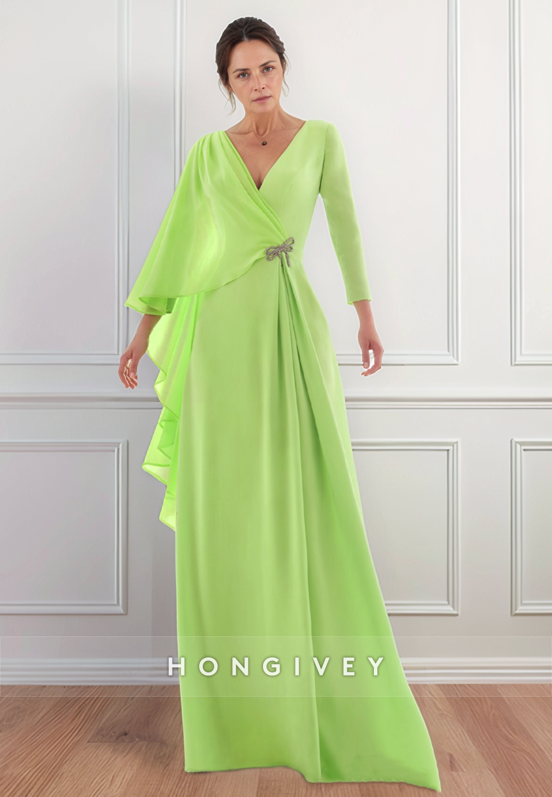 Sheath Floor-Length V Neck Chiffon Shawl Long Sleeve Pleated Zipper Mother of the Bride Dress