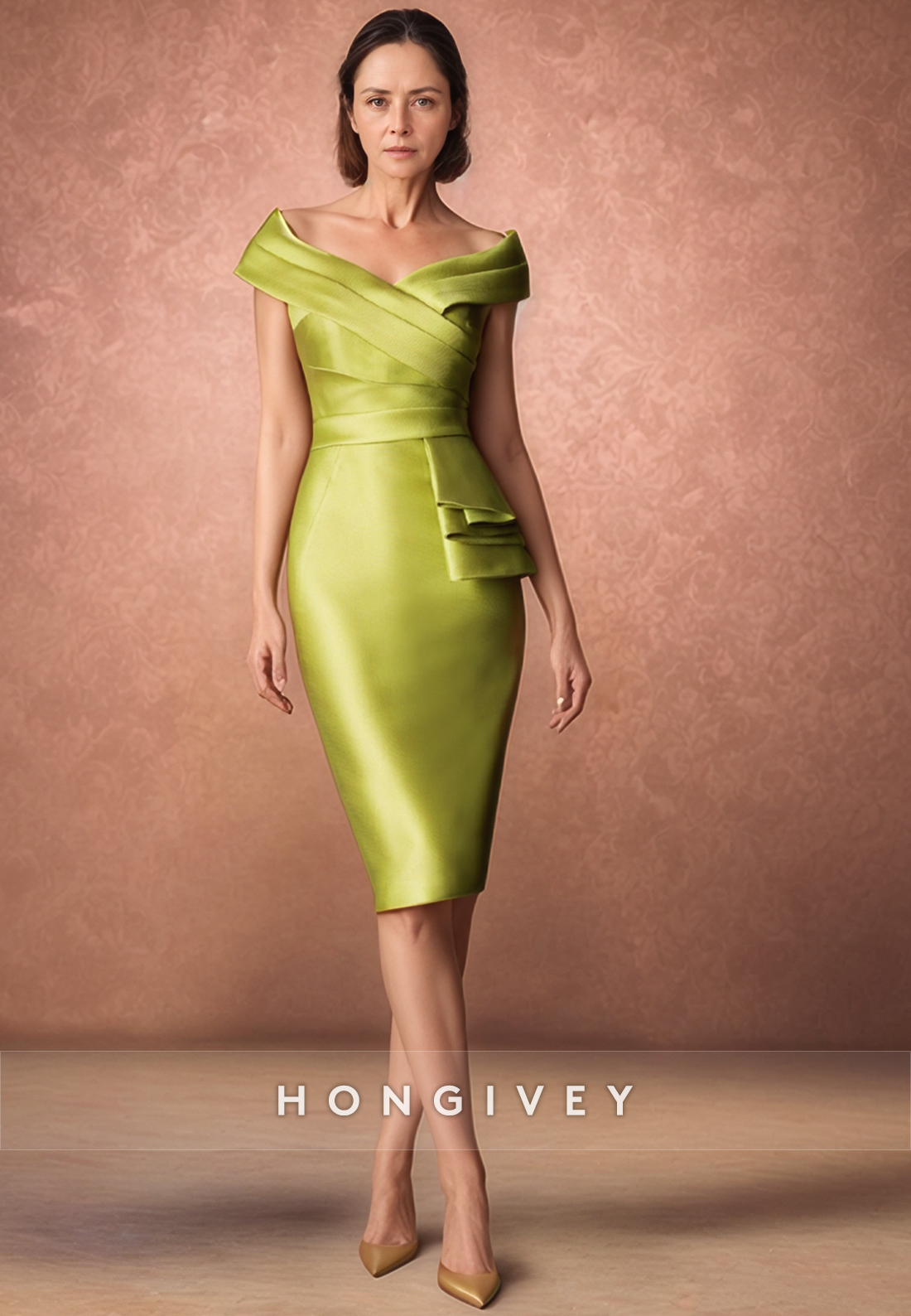 Elegant Avocado Green Cocktail Dresse Sheath Off the Shoulder Satin Pleated Mother of the BrideDress