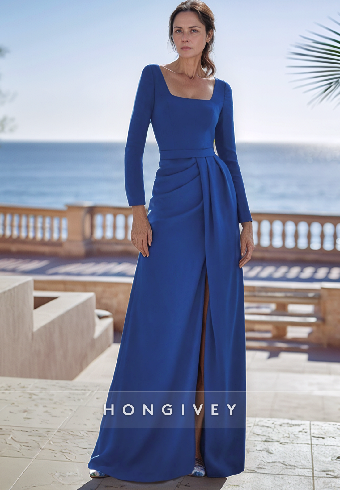 Split Pleated Long Sleeve Satin Square Royal Blue Floor-Length Sheath Mother of the Bride Dress