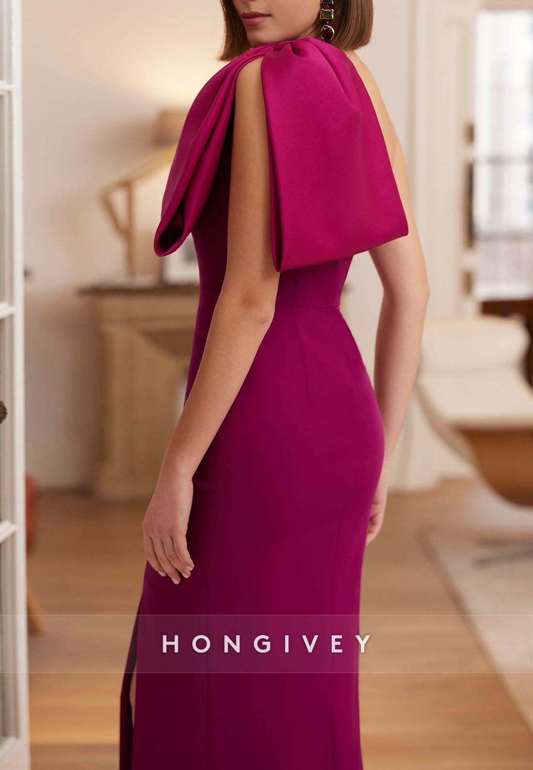 Elevate your evening look with our High Slit Column Ankle-Length One Shoulder Bowknot Evening Gown. The high slit and one shoulder design exude sophistication, while the bowknot adds a touch of elegance. Walk confidently in this ankle-length gown, perfect for any upscale occasion.