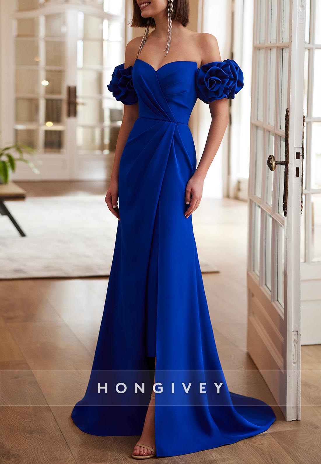Evening Gown Column Sweep Mother of Bride Train Sweetheart Satin Flowers Sleeves Pleated