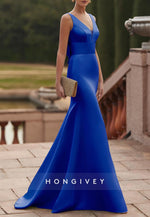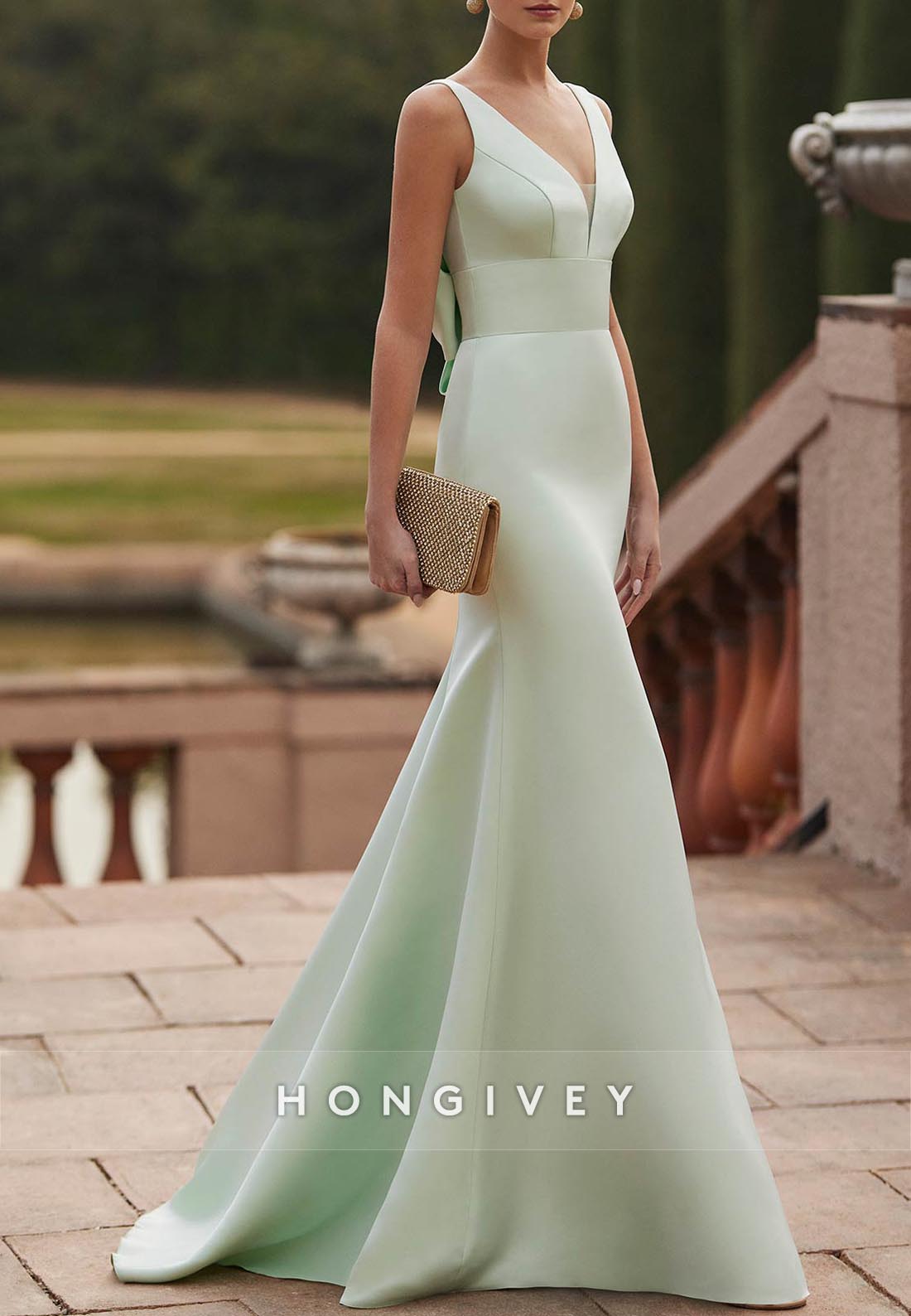 Low Back Bowknot Trumpet Sweep Mother of Bride Train V Neck Satin Pleated Evening Gown