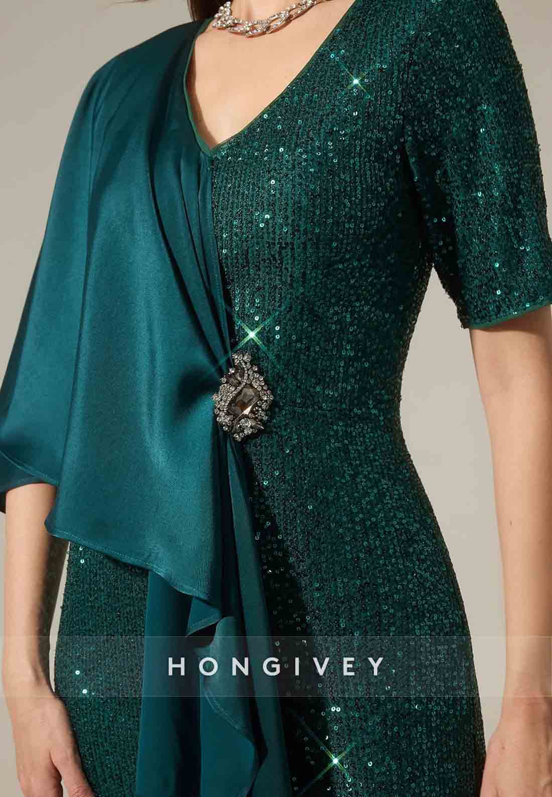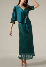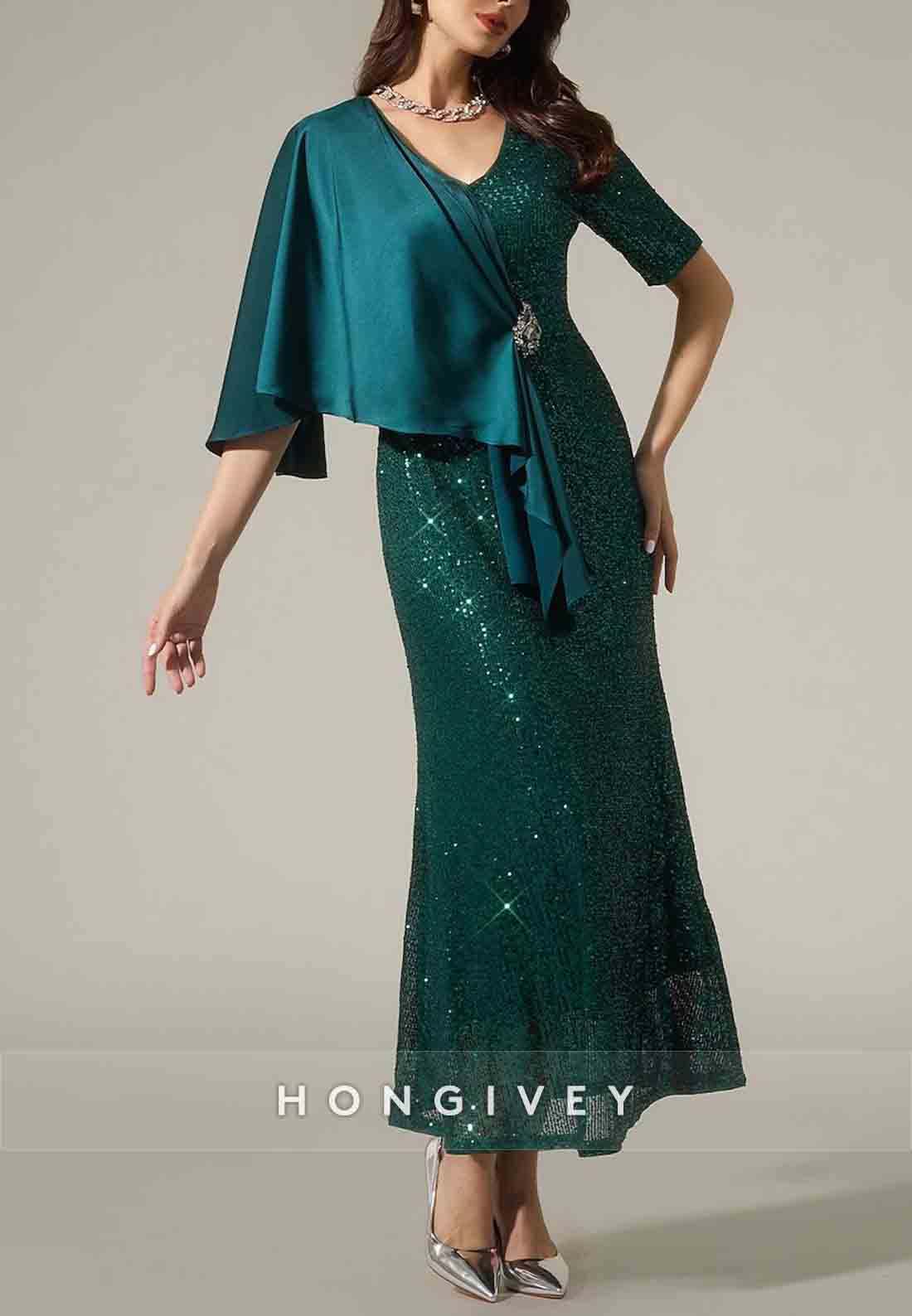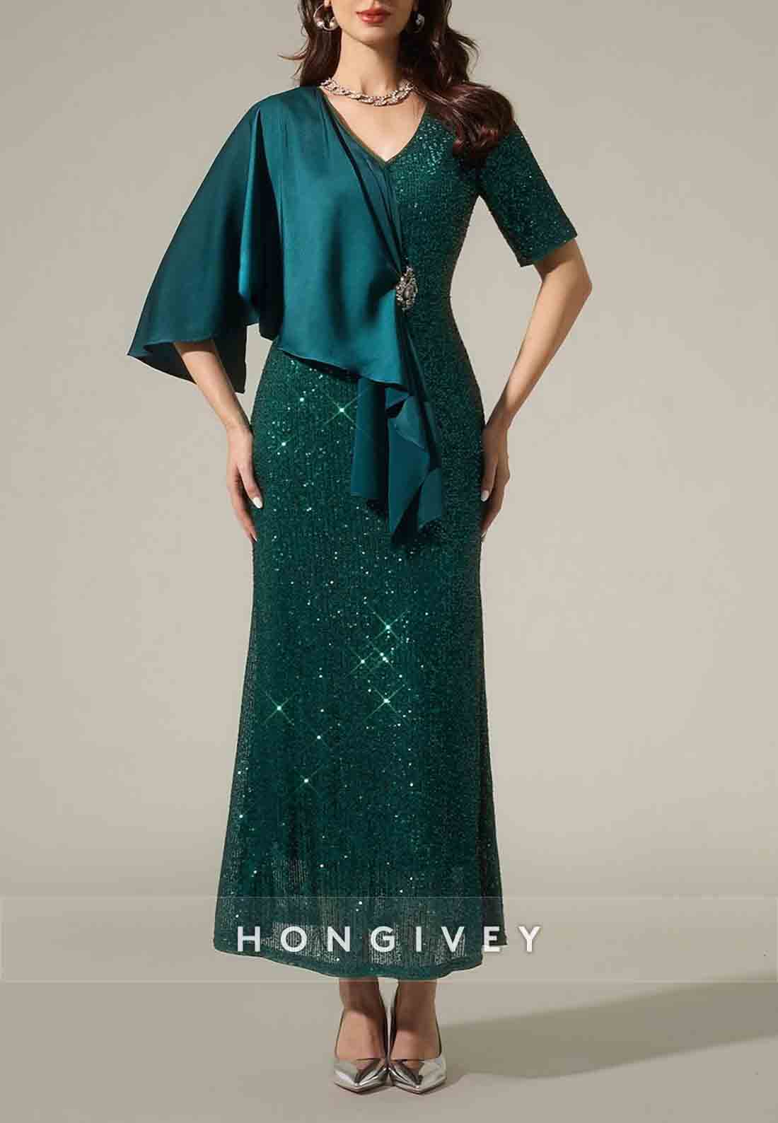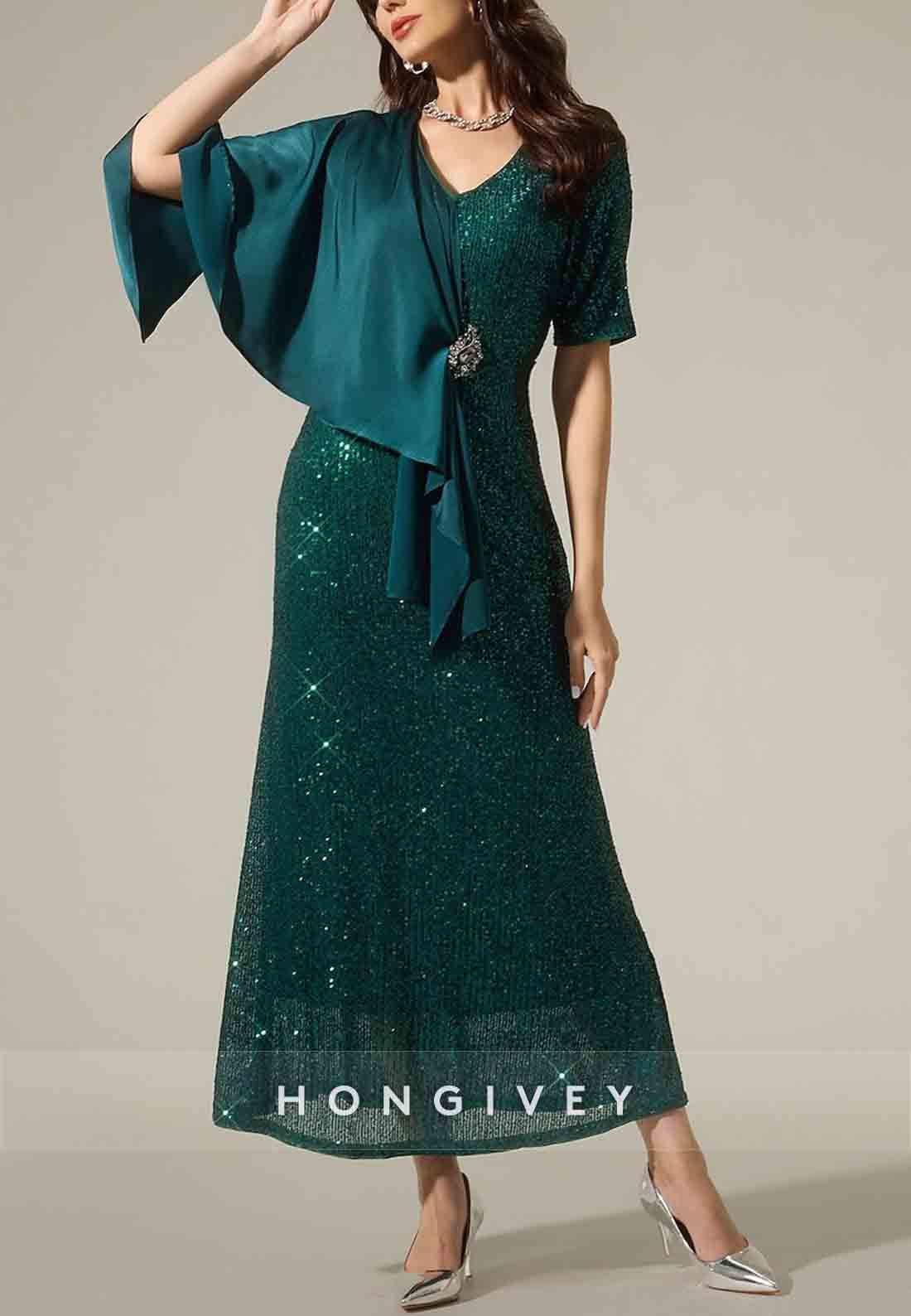 Trumpet Ankle-Length V Neck Short Sleeve V Back Glitter Mother of the Bride Dress