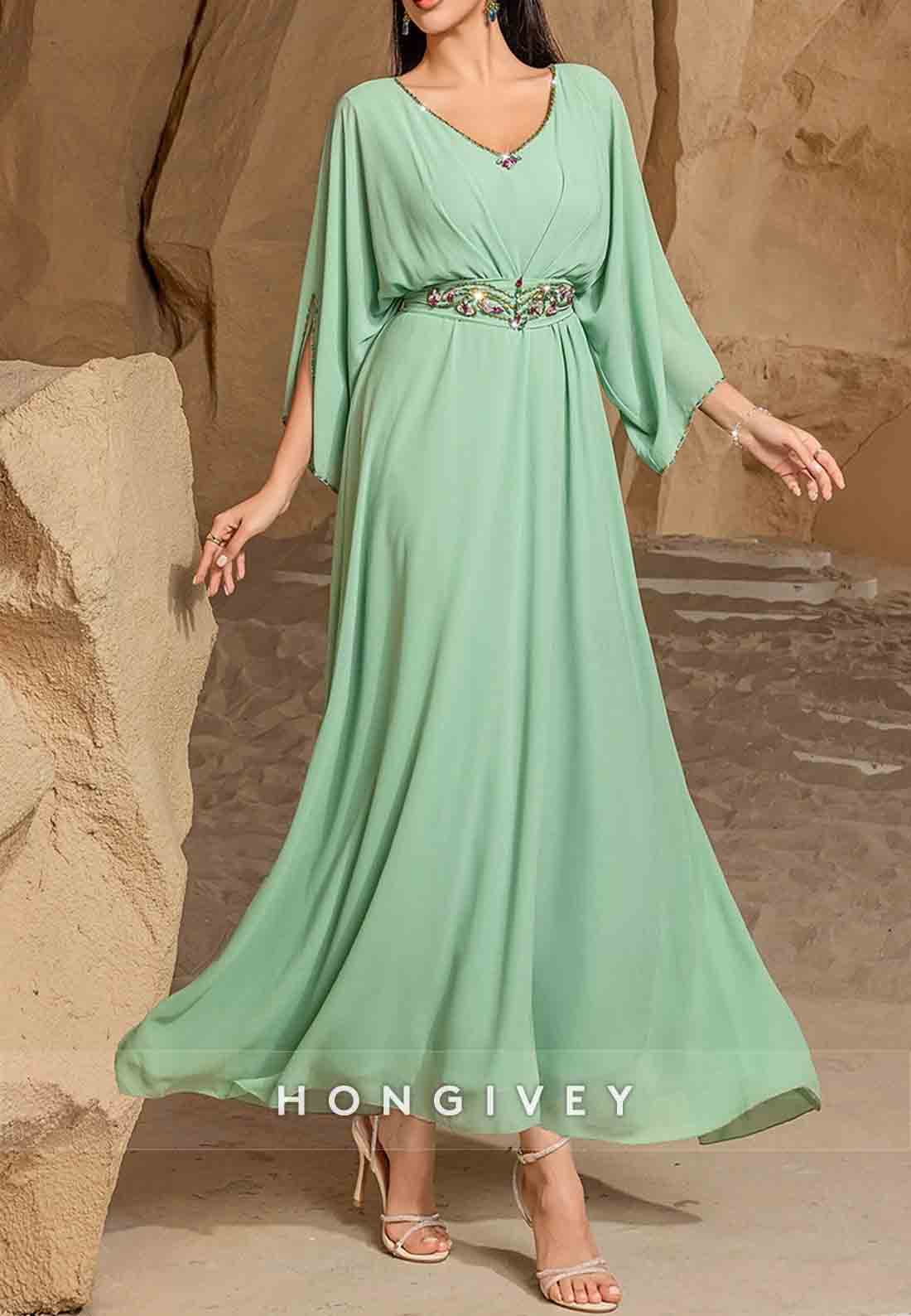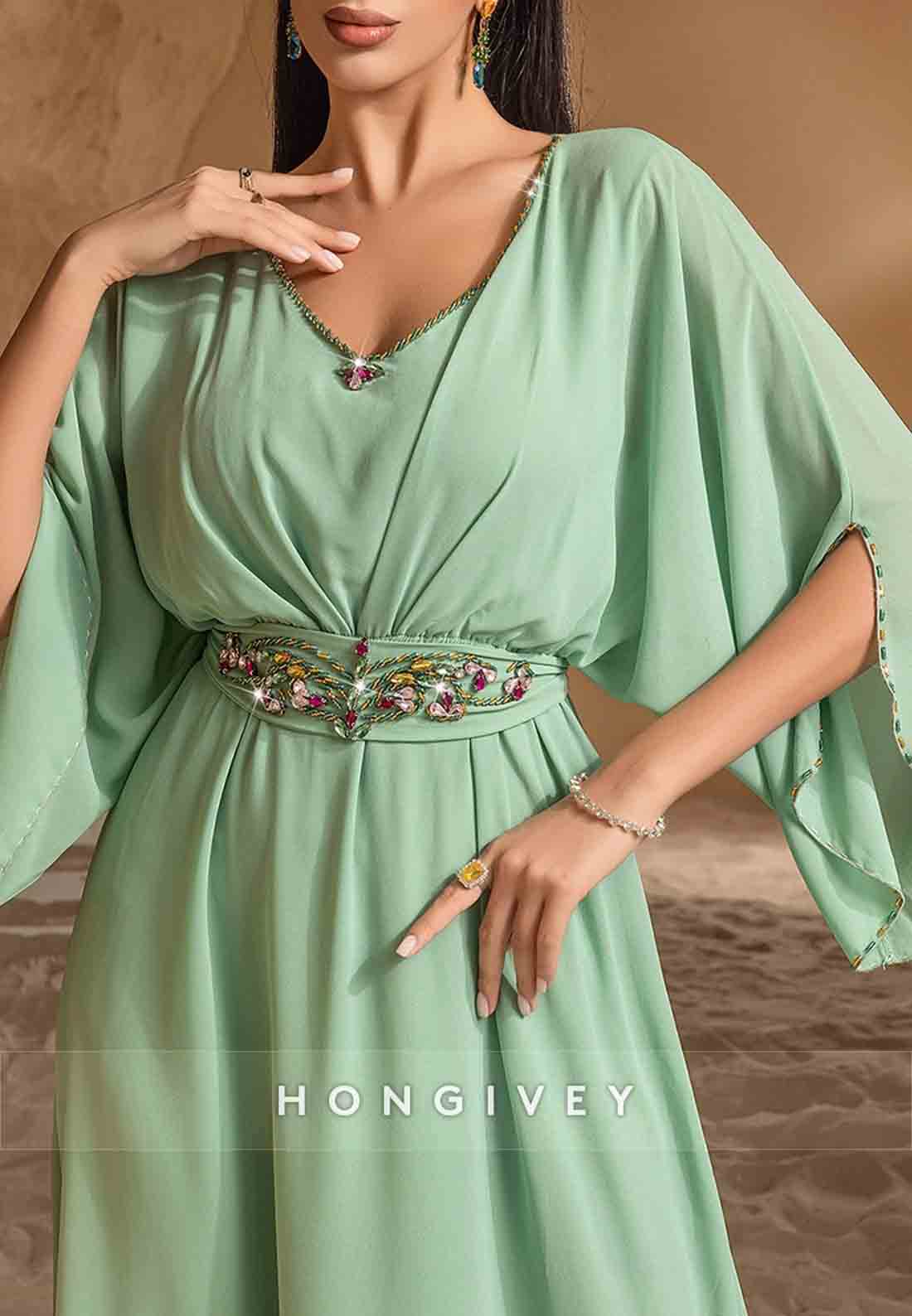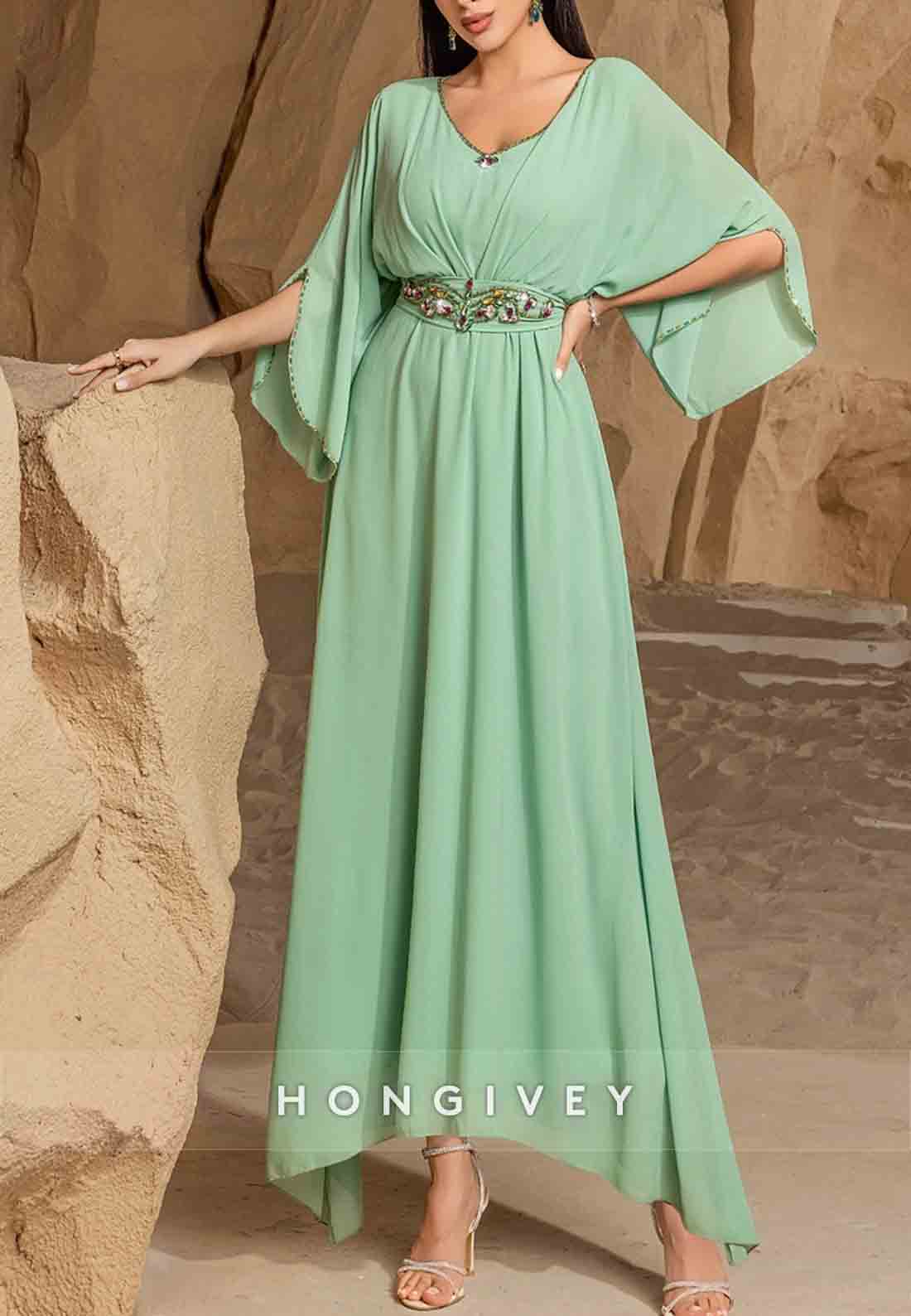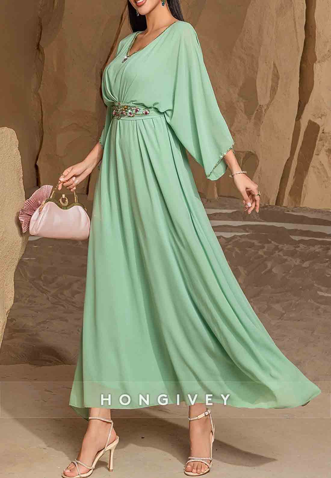 V Neck A-Line Tea-Length Flutter Sleeves Mother of the Bride Dress