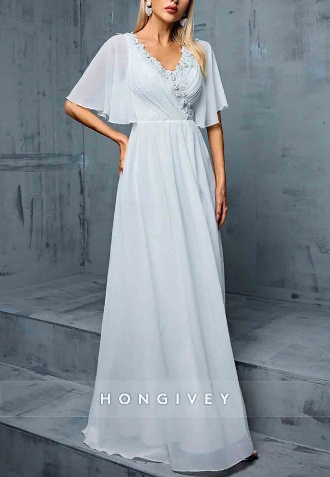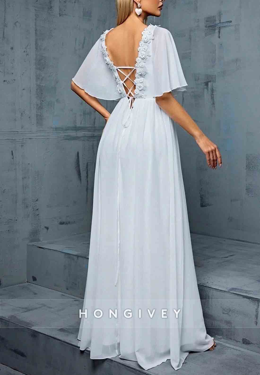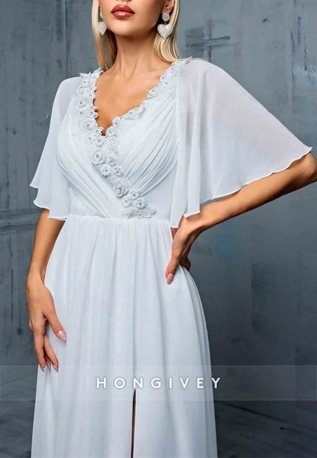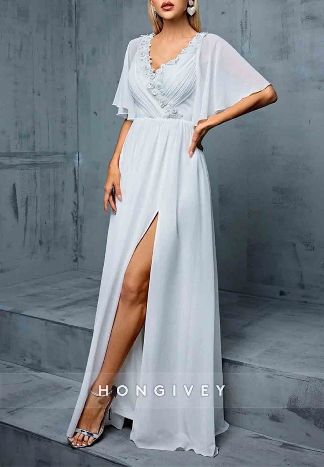 High Slit V-Neck Tie Back A-line Flutter Sleeves Flowers Mother of the Bride Dress
