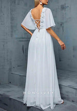Exude refined allure in this distinguished A-line Mother of the Bride dress. The elegant V-neckline frames your décolletage with sophisticated grace, while delicate flutter sleeves offer gentle movement and flattering coverage. Artful floral embellishments enhance the dress's timeless appeal, complemented by a tasteful high slit that ensures ease of movement. The thoughtfully designed tie-back detail creates a customized silhouette, allowing for a perfectly tailored fit that celebrates your distinctive presence on this momentous occasion.