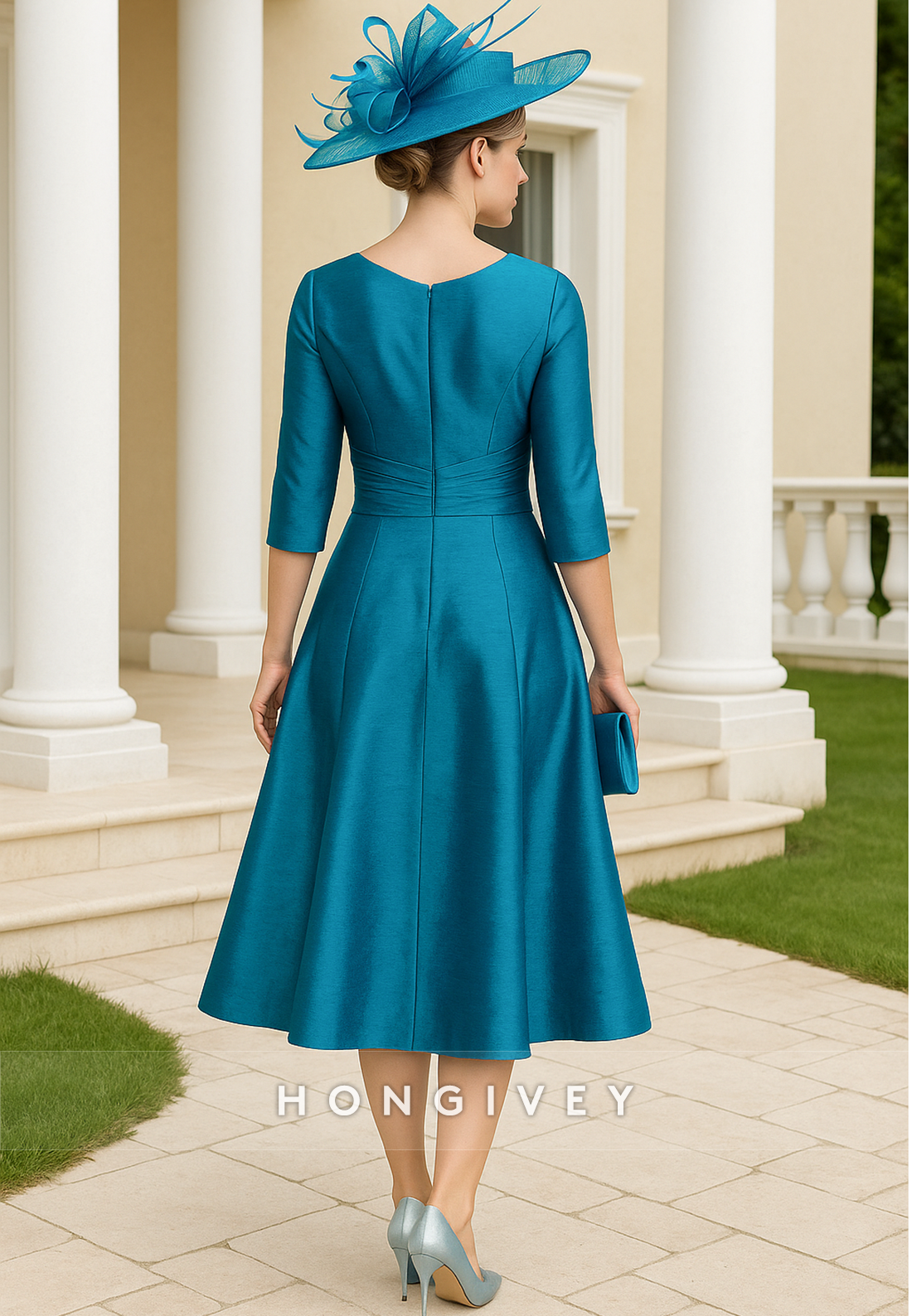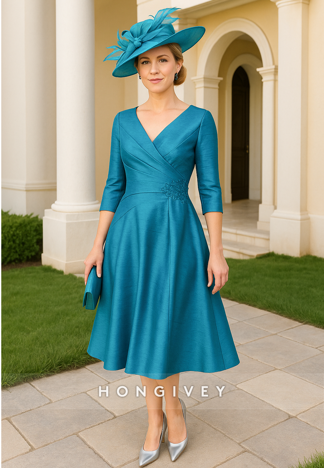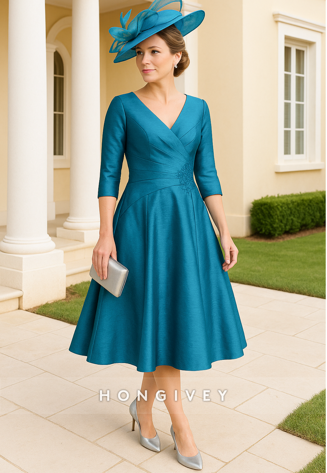 V-Neck 3/4 Sleeve Princess Cocktail Dresses Satin Pleated Tea-Length Mother of Bride Dresses