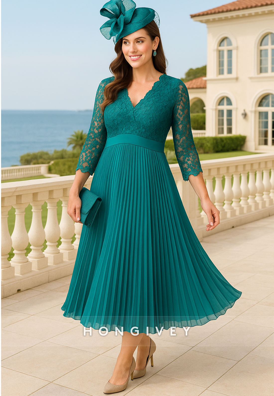 This tea-length mother of the bride dress features a delicate lace scalloped neckline and elegant 3/4 sleeves. Its A-line silhouette is enhanced with soft ruffles, offering a timeless and sophisticated look that beautifully complements any wedding celebration.