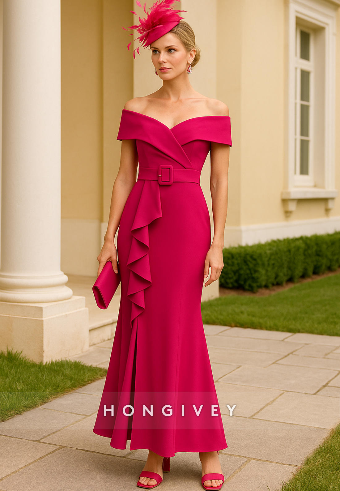 Ankle-Length Off the Shoulder Trumpet Pleated Waistband Pleated Mother of Bride Dresses