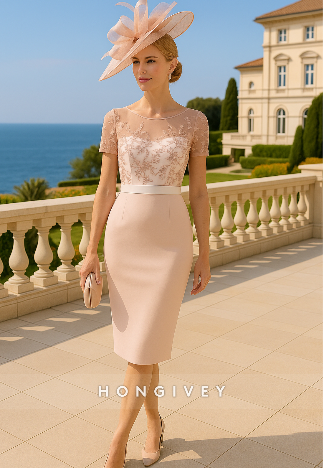 Illusion Neck Short Sleeves Cocktail Dresses Tea-Length Sheath Mother of Bride Dresses