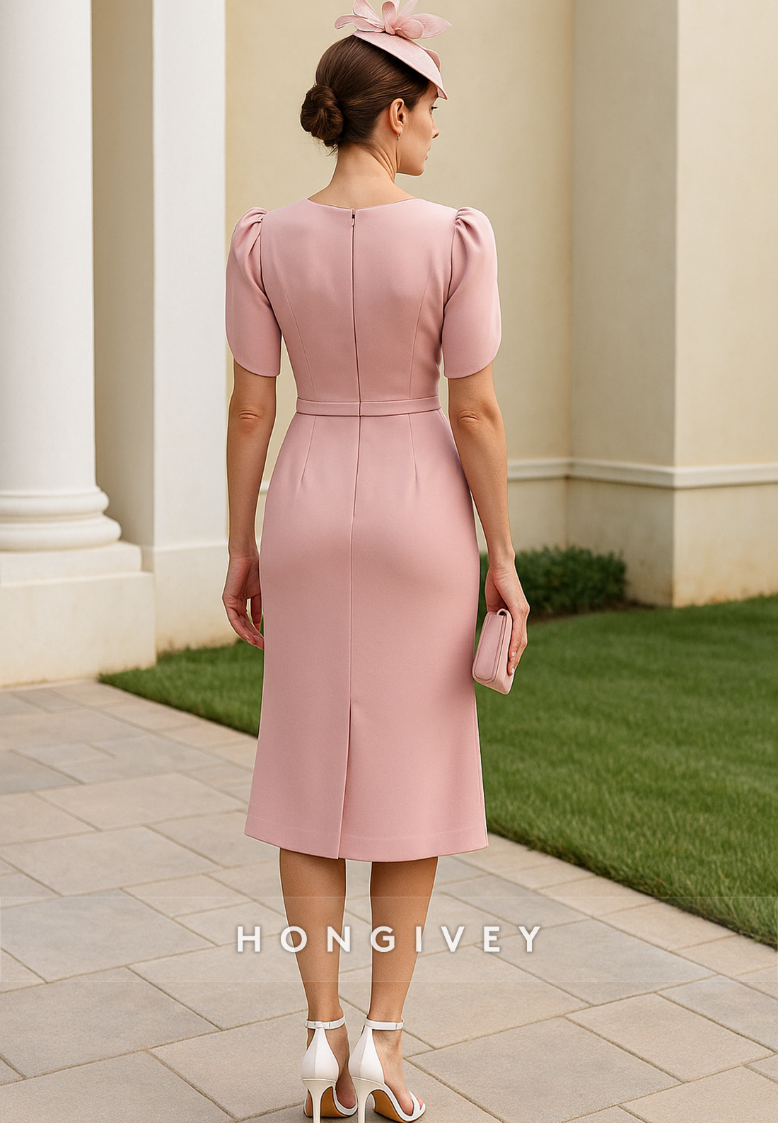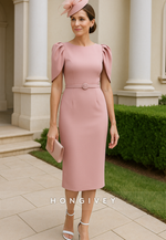 Tea-Length Scoop Short Sleeves Waistband Column Mother of the Bride Dresses