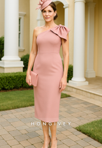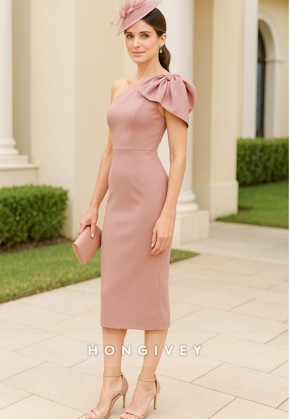 This elegant one-shoulder sheath dress features a delicate bowknot and pleated detailing, creating a refined silhouette perfect for the mother of the bride. Its tea-length design offers a graceful balance of tradition and modern style, ensuring comfort and sophistication throughout the celebration. Ideal for making a memorable impression on this special day.