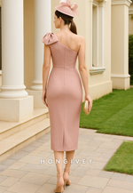 One Shoulder Sheath Bowknot Pleated Tea-Length Mother of the Bride Dresses
