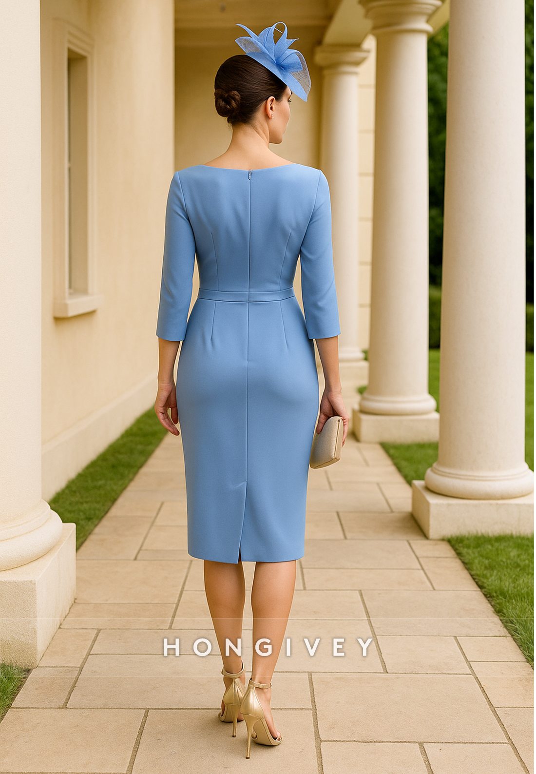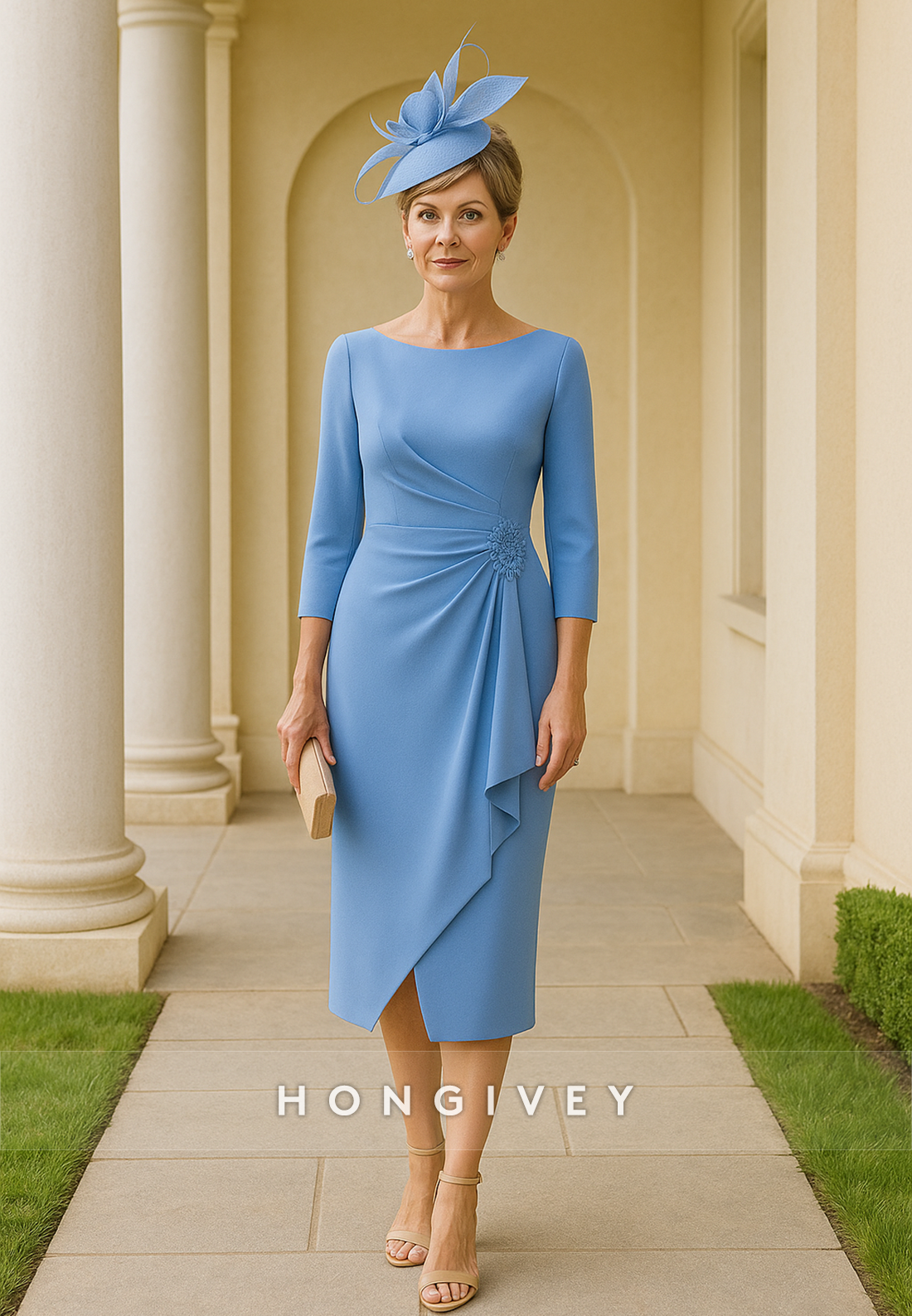 Simple Pleated Applique Tea-Length Cocktail Dresses 3/4 Sleeve Sheath Mother of the Bride Dresses
