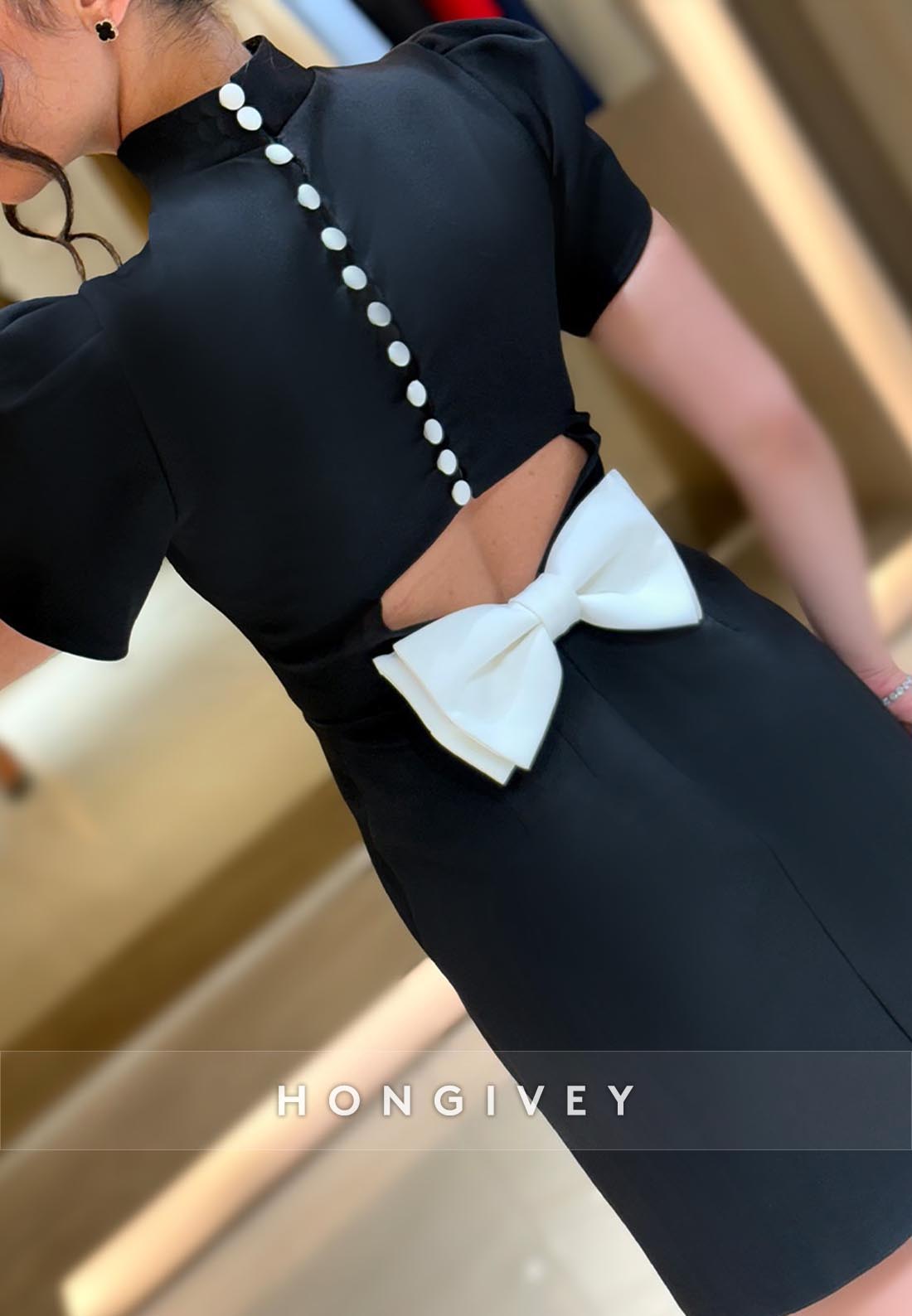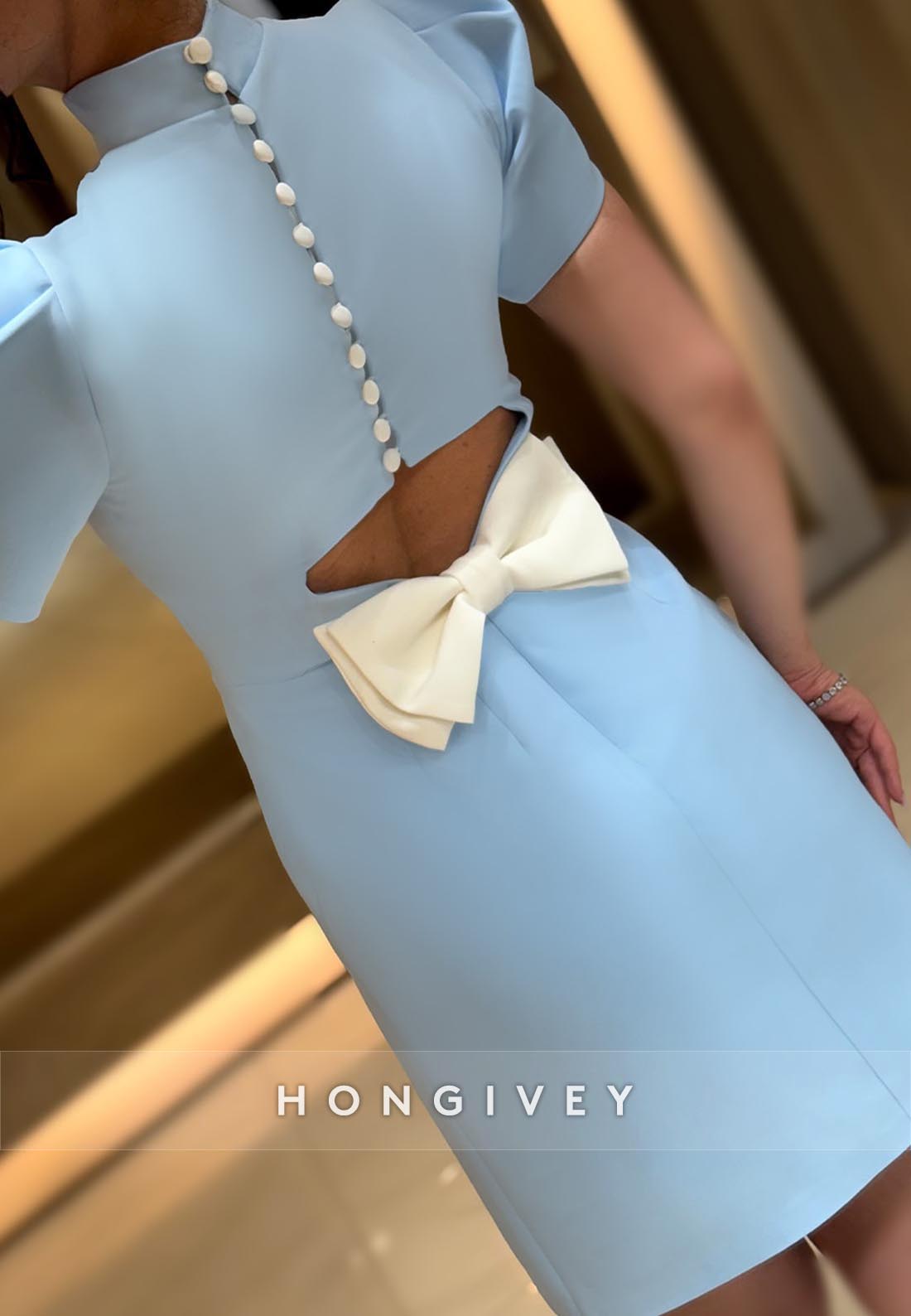 Bowknot Back Hole Sheath High Neck Short Sleeve Mini Party Dresses