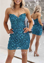 Sleeveless Sheath Strapless V-Neck Pleated Sequined Mini Homecoming Dresses