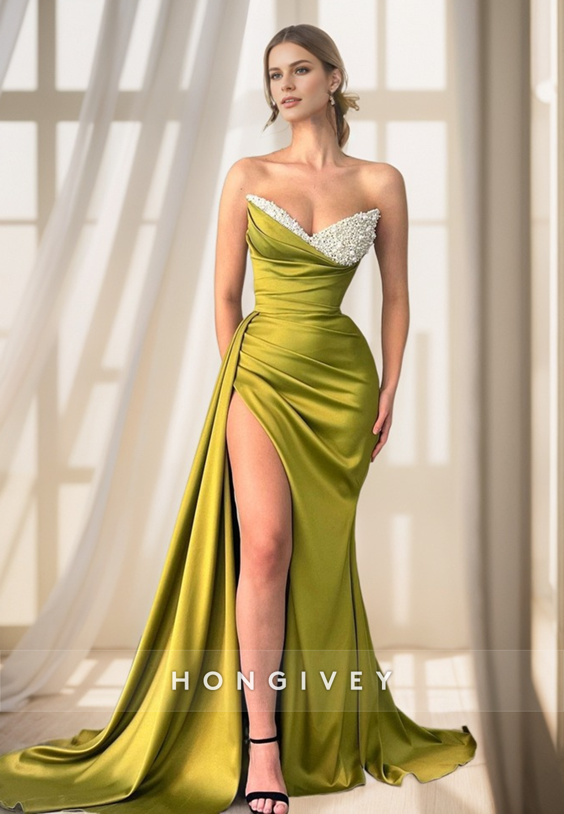 Ormate Sheer Beaded Tube Top Paneled High Slit With Train Evening Party Prom Dress