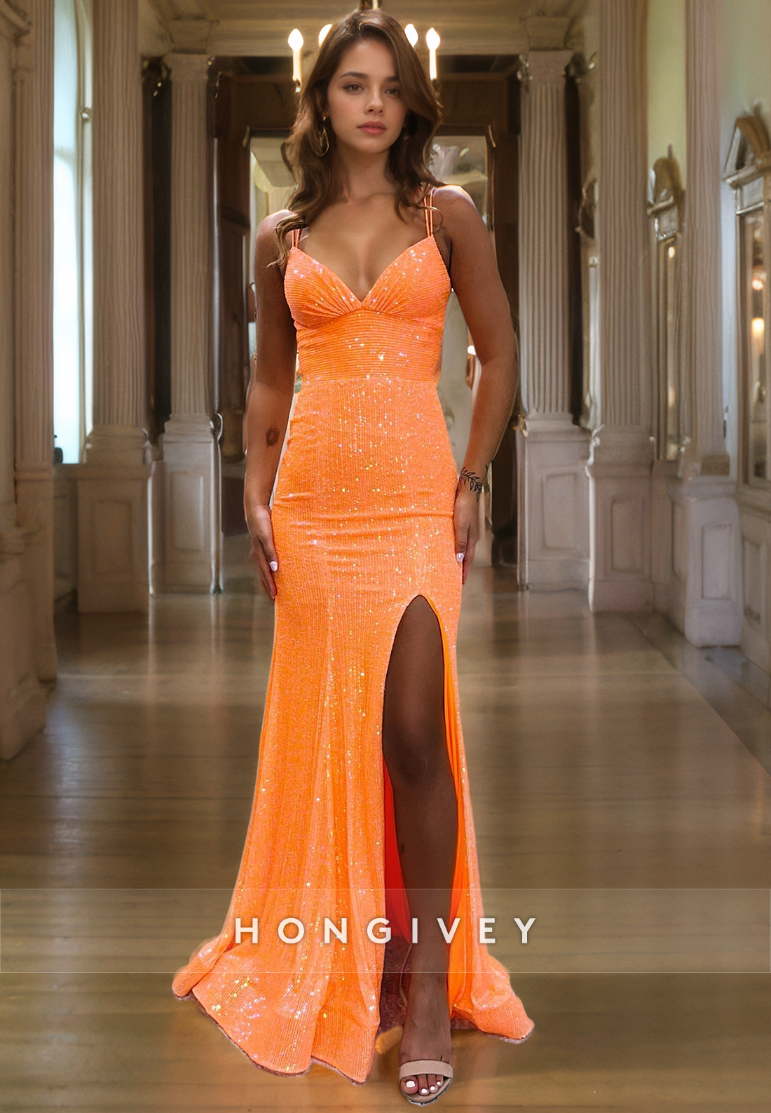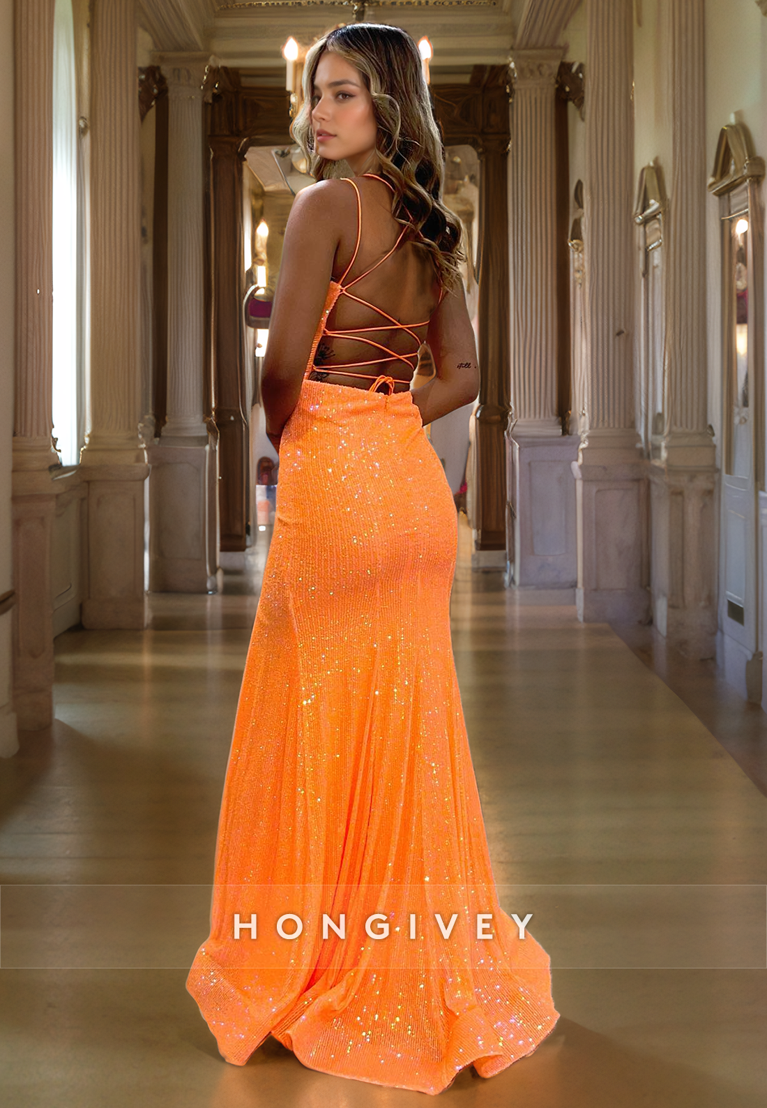 Sparkly Crisscross Back With Train And Slit Formal Party Evening Prom Dress