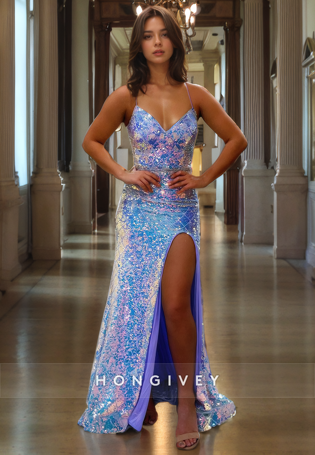 L1187 - Sparkly Fully Sequined Lace-Up Back With Train And Slit Evening Formal Party Prom Dress
