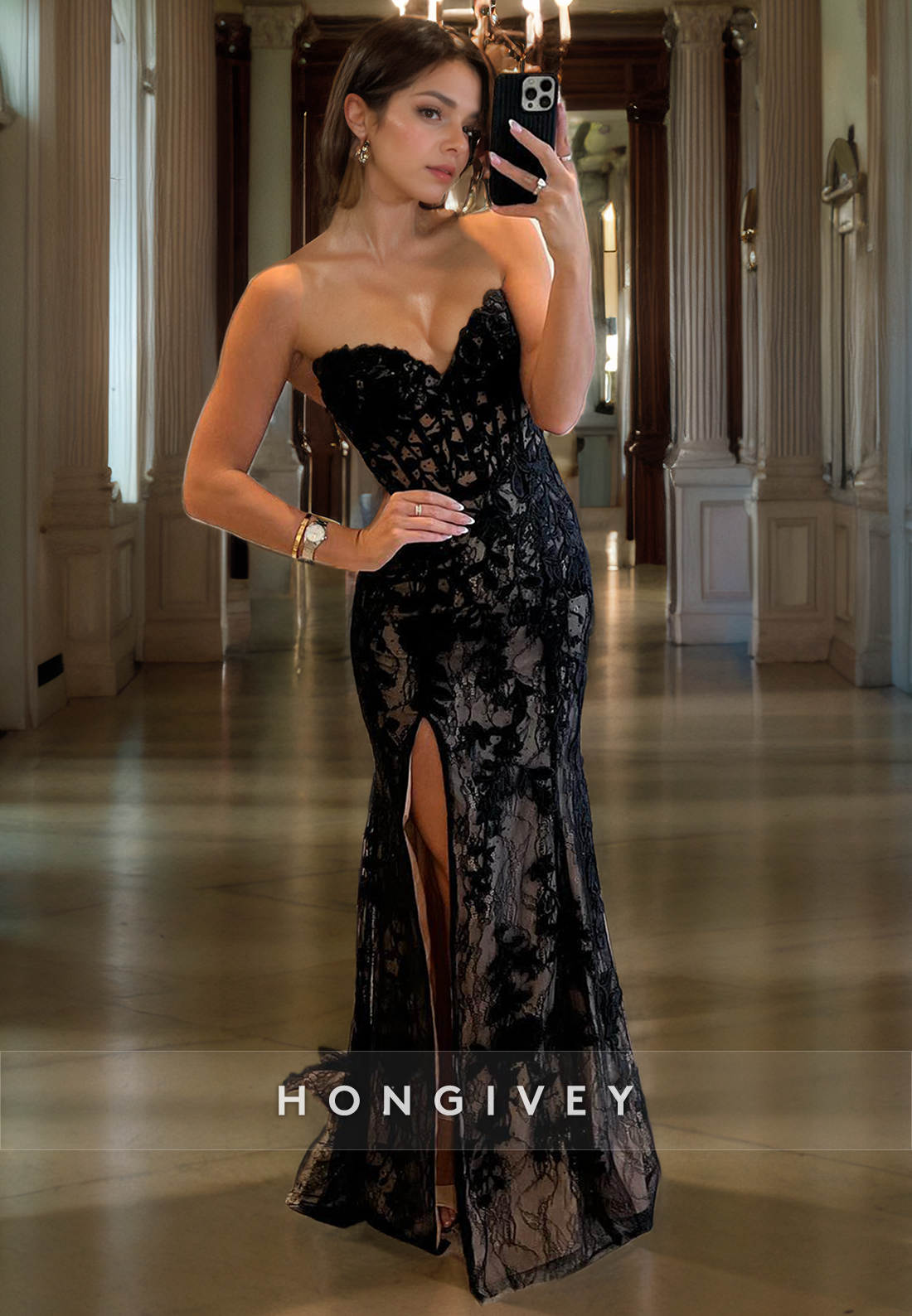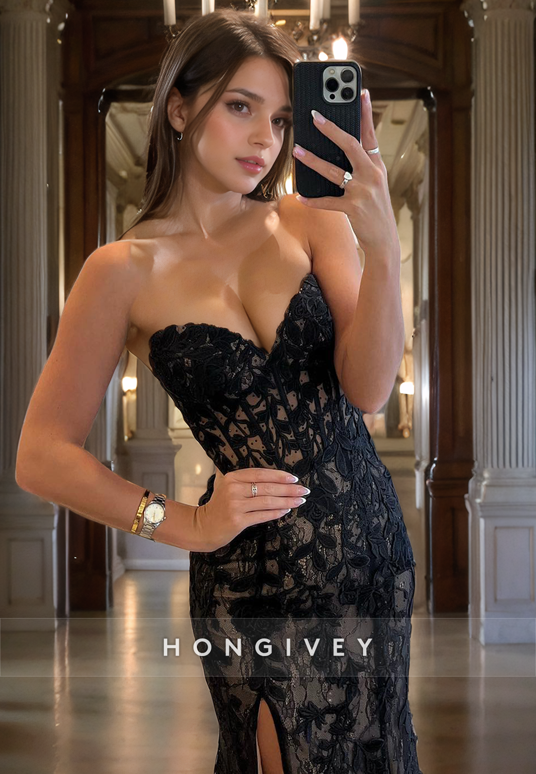 Sexy Lace Fitted Sweetheart Strapless Empire Illusion Appliques With Side Slit Party Prom Evening Dress