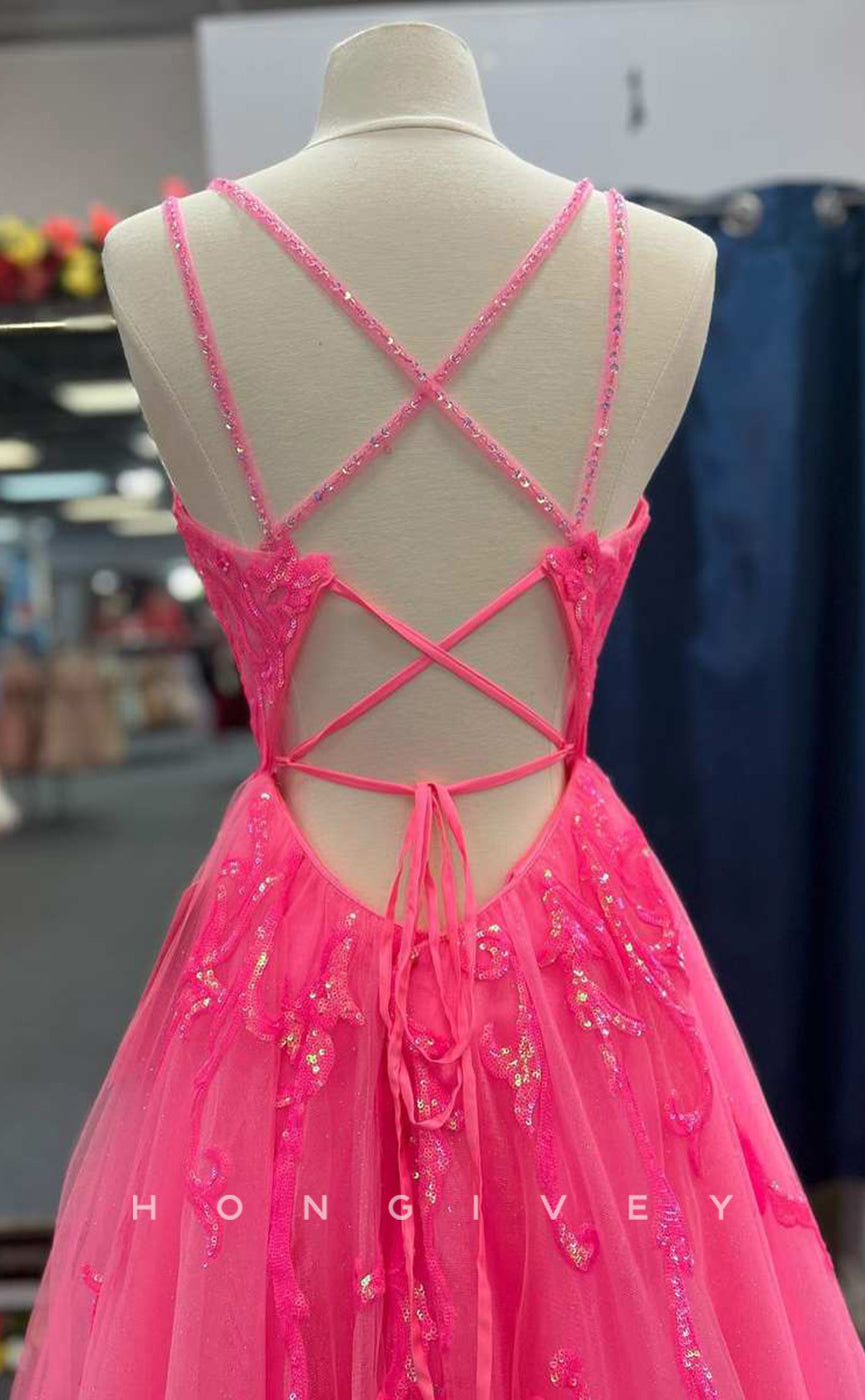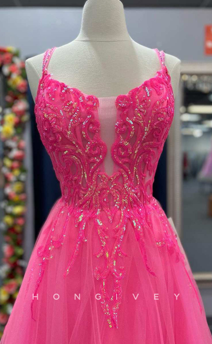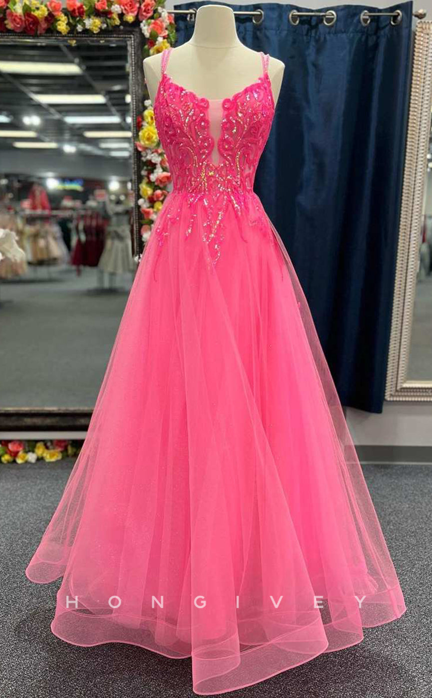 L2492 - Sexy Tulle A-Line Bateau Spaghetti Straps Empire Appliques Beaded Party Prom Evening Dress