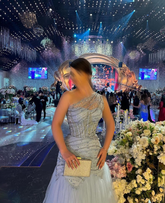 Modest Mermaid Strapless White Sequin Long Prom Dresses With Beads Evening Party Formal Gown