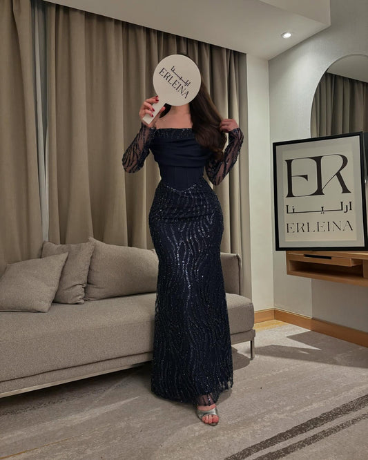 Off the Shoulder Lace Long Sleeve Sequins Sparkle Mermaid Evening Dress