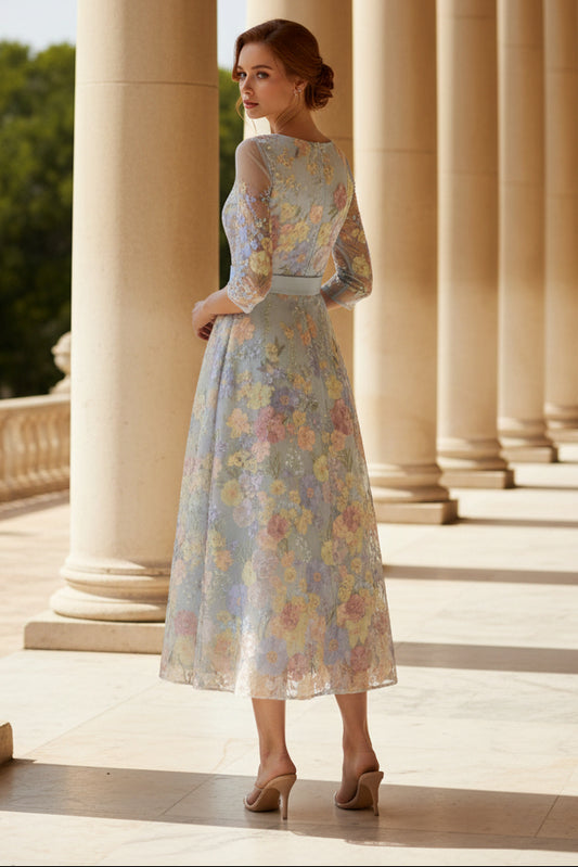 Scoop Lace Mother of the Bride Dresses Floral Embroidery Tea-Length 3/4 Sleeves Bowknot