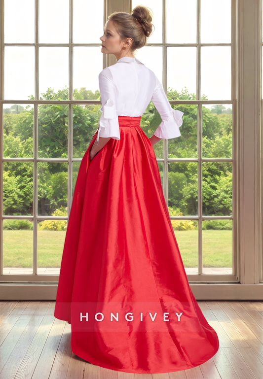 HM294 - V-Neck Long Sleeve A-Line Empire With Slit Cocktail Evening Dress