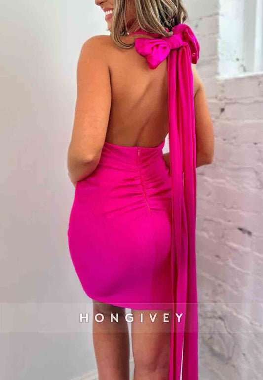 Low V-Neck Mini Sheath Tie Back Sleeveless Homecoming Dresses with Bowknot