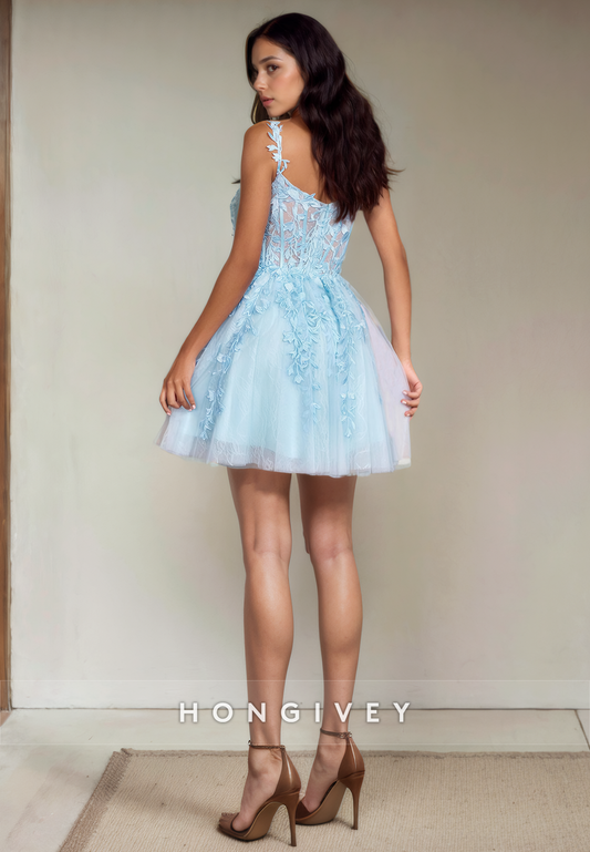 Sweetheart Spaghetti Straps Lace Applique Tulle Short Party Homecoming Dress