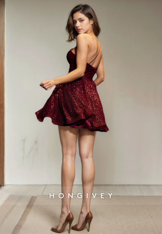 A-Line One Shoulder Sleeveless Sequined Short Party Homecoming Dress