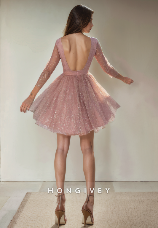 A-Line Round 3/4 Sleeves Tulle Short Party Homecoming Dress