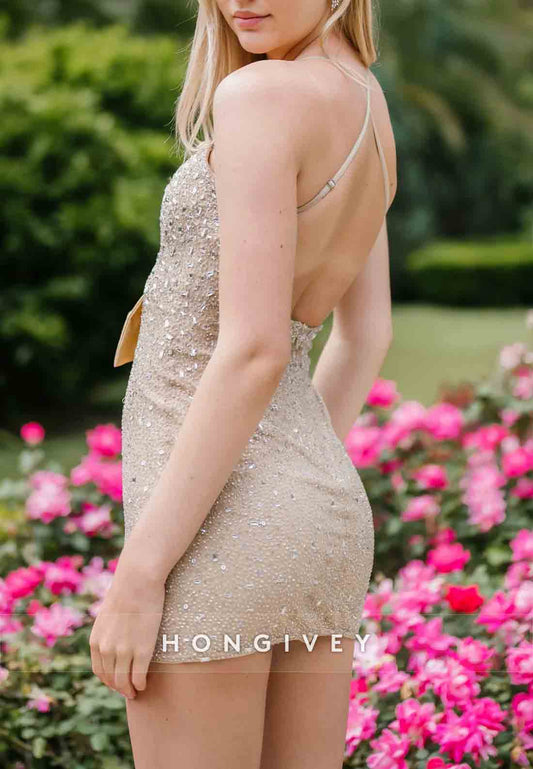 Spaghetti Straps Sheath Low V-Neck Sleeveless Mini Homecoming Dresses